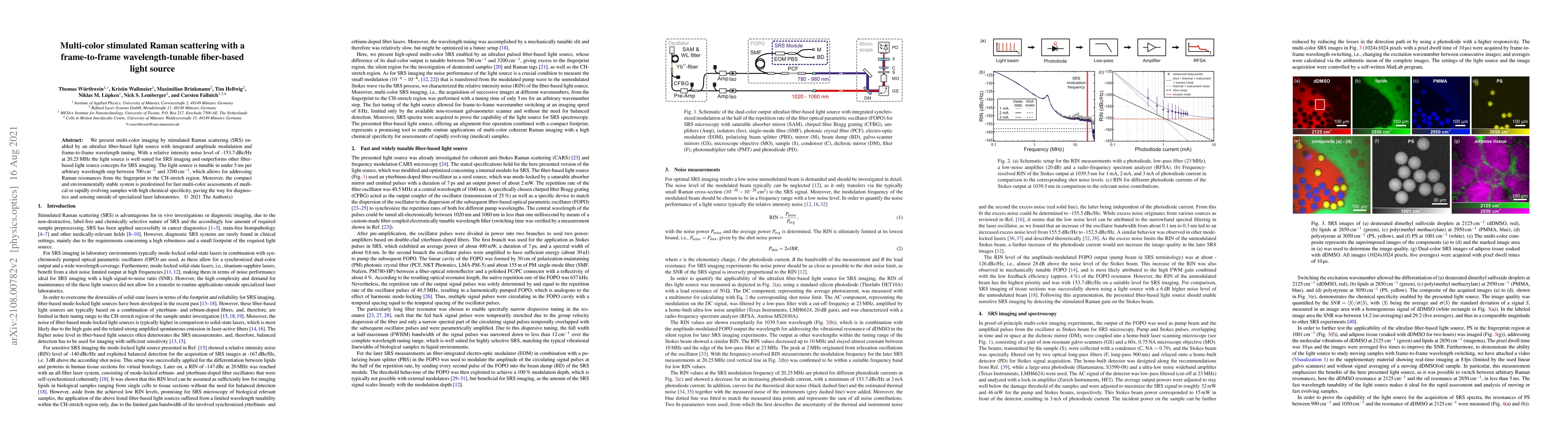 This paper introduces a fiber-based light source for multi-color stimulated Raman scattering imaging, featuring frame-to-frame wavelength tuning and amplitude modulation. The system achieves high chemical specificity and rapid tuning between 700 cm$^{-1}$ and 3200 cm$^{-1}$, making it ideal for medical diagnostics and sensing outside specialized labs.