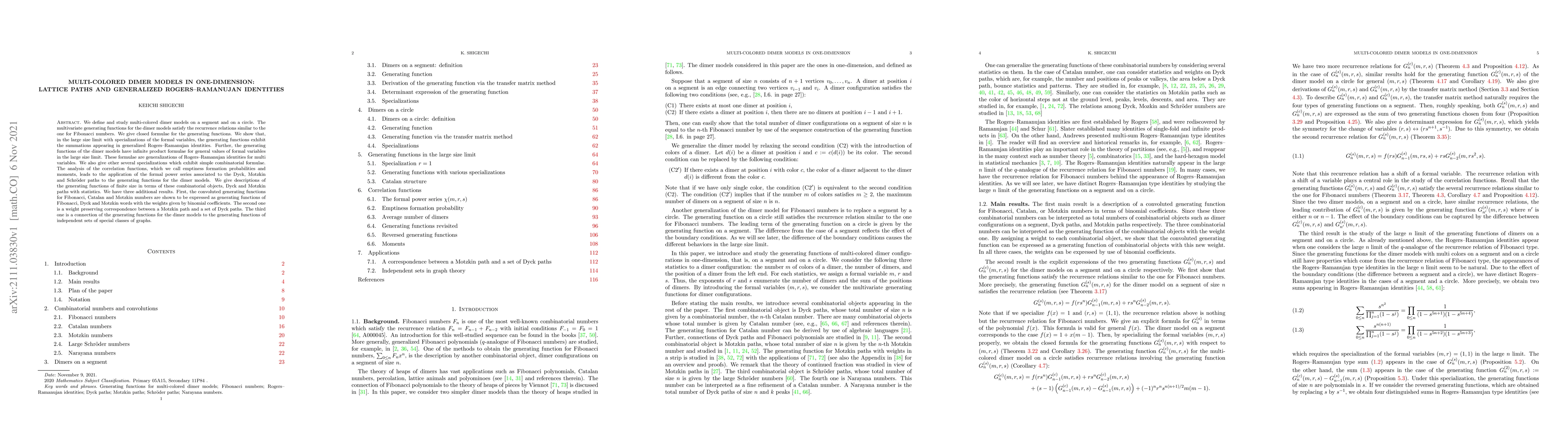 We define and study multi-colored dimer models on a segment and on a circle. The multivariate generating functions for the dimer models satisfy the recurrence relations similar to the one for Fibonacci numbers. We give closed formulae for the generating functions. We show that, in the large size limit with specializations of the formal variables, the generating functions exhibit the summations appearing in generalized Rogers--Ramanujan identities. Further, the generating functions of the dimer models have infinite product formulae for general values of formal variables in the large size limit. These formulae are generalizations of Rogers--Ramanujan identities for multi variables. We also give other several specializations which exhibit simple combinatorial formulae. The analysis of the correlation functions, which we call emptiness formation probabilities and moments, leads to the application of the formal power series associated to the Dyck, Motzkin and Schr\"oder paths to the generating functions for the dimer models. We give descriptions of the generating functions of finite size in terms of these combinatorial objects, Dyck and Motzkin paths with statistics. We have three additional results. First, the convoluted generating functions for Fibonacci, Catalan and Motzkin numbers are shown to be expressed as generating functions of Fibonacci, Dyck and Motzkin words with the weights given by binomial coefficients. The second one is a weight preserving correspondence between a Motzkin path and a set of Dyck paths. The third one is a connection of the generating functions for the dimer models to the generating functions of independent sets of special classes of graphs.