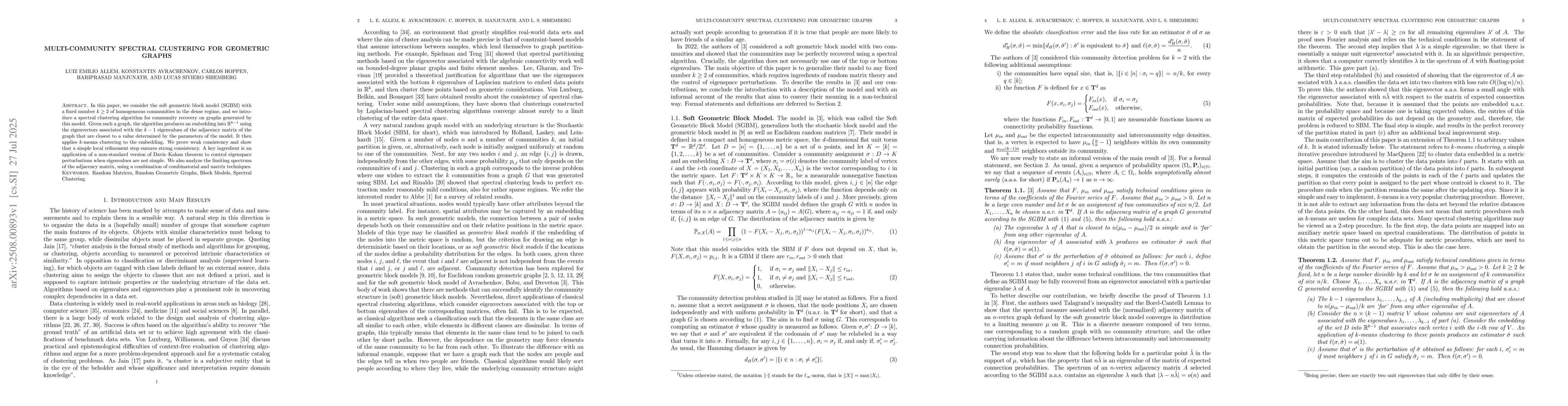 In this paper, we consider the soft geometric block model (SGBM) with a fixed number $k \geq 2$ of homogeneous communities in the dense regime, and we introduce a spectral clustering algorithm for community recovery on graphs generated by this model. Given such a graph, the algorithm produces an embedding into $\mathbb{R}^{k-1}$ using the eigenvectors associated with the $k-1$ eigenvalues of the adjacency matrix of the graph that are closest to a value determined by the parameters of the model. It then applies $k$-means clustering to the embedding. We prove weak consistency and show that a simple local refinement step ensures strong consistency. A key ingredient is an application of a non-standard version of Davis-Kahan theorem to control eigenspace perturbations when eigenvalues are not simple. We also analyze the limiting spectrum of the adjacency matrix, using a combination of combinatorial and matrix techniques.