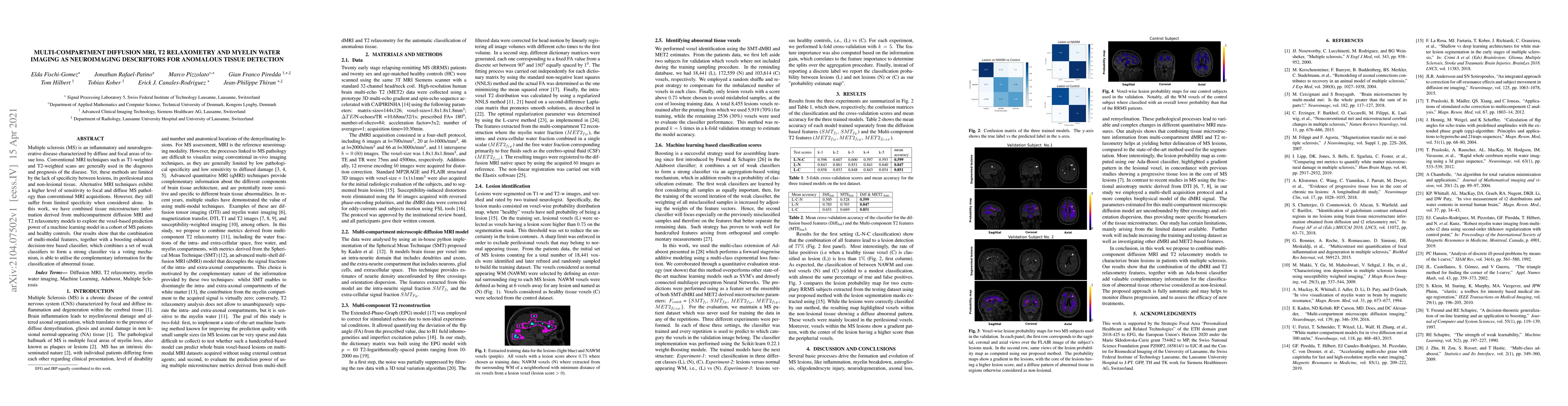 This paper combines multi-compartment diffusion MRI, T2 relaxometry, and myelin water imaging to enhance the specificity of detecting anomalous tissue in multiple sclerosis patients. The study uses a boosting enhanced decision-tree classifier to integrate these neuroimaging descriptors, achieving better classification of abnormal tissue compared to conventional MRI techniques.