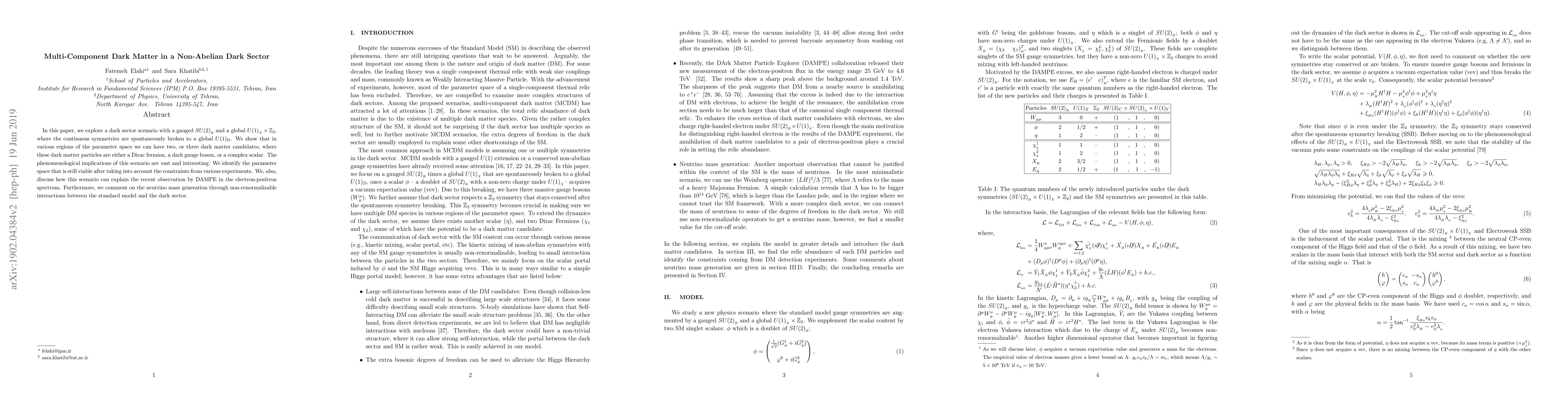 In this paper, we explore a dark sector scenario with a gauged $SU(2)_R$ and a global $U(1)_X \times \mathbb{Z}_2$, where the continuous symmetries are spontaneously broken to a global $U(1)_D$. We show that in various regions of the parameter space we can have two, or three dark matter candidates, where these dark matter particles are either a Dirac fermion, a dark gauge boson, or a complex scalar. The phenomenological implications of this scenario are vast and interesting. We identify the parameter space that is still viable after taking into account the constraints from various experiments. We, also, discuss how this scenario can explain the recent observation by DAMPE in the electron-positron spectrum. Furthermore, we comment on the neutrino mass generation through non-renormalizable interactions between the standard model and the dark sector.