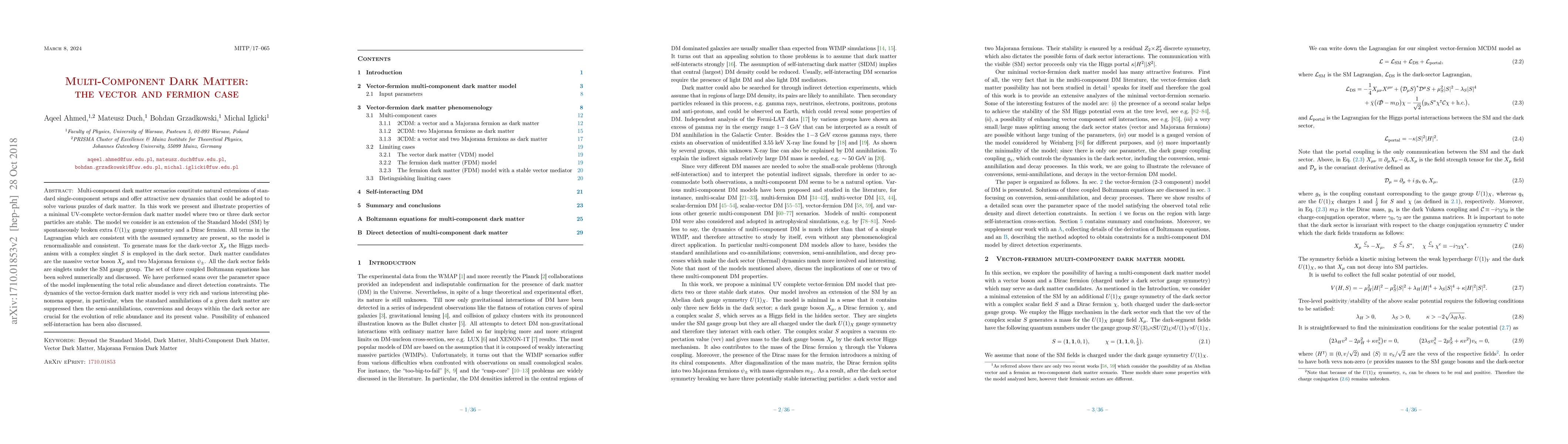 Multi-component dark matter scenarios constitute natural extensions of standard single-component setups and offer attractive new dynamics that could be adopted to solve various puzzles of dark matter. In this work we present and illustrate properties of a minimal UV-complete vector-fermion dark matter model where two or three dark sector particles are stable. The model we consider is an extension of the Standard Model (SM) by spontaneously broken extra $U(1)_X$ gauge symmetry and a Dirac fermion. All terms in the Lagrangian which are consistent with the assumed symmetry are present, so the model is renormalizable and consistent. To generate mass for the dark-vector $X_\mu$ the Higgs mechanism with a complex singlet $S$ is employed in the dark sector. Dark matter candidates are the massive vector boson $X_\mu$ and two Majorana fermions $\psi_\pm$. All the dark sector fields are singlets under the SM gauge group. The set of three coupled Boltzmann equations has been solved numerically and discussed. We have performed scans over the parameter space of the model implementing the total relic abundance and direct detection constraints. The dynamics of the vector-fermion dark matter model is very rich and various interesting phenomena appear, in particular, when the standard annihilations of a given dark matter are suppressed then the semi-annihilations, conversions and decays within the dark sector are crucial for the evolution of relic abundance and its present value. Possibility of enhanced self-interaction has been also discussed.