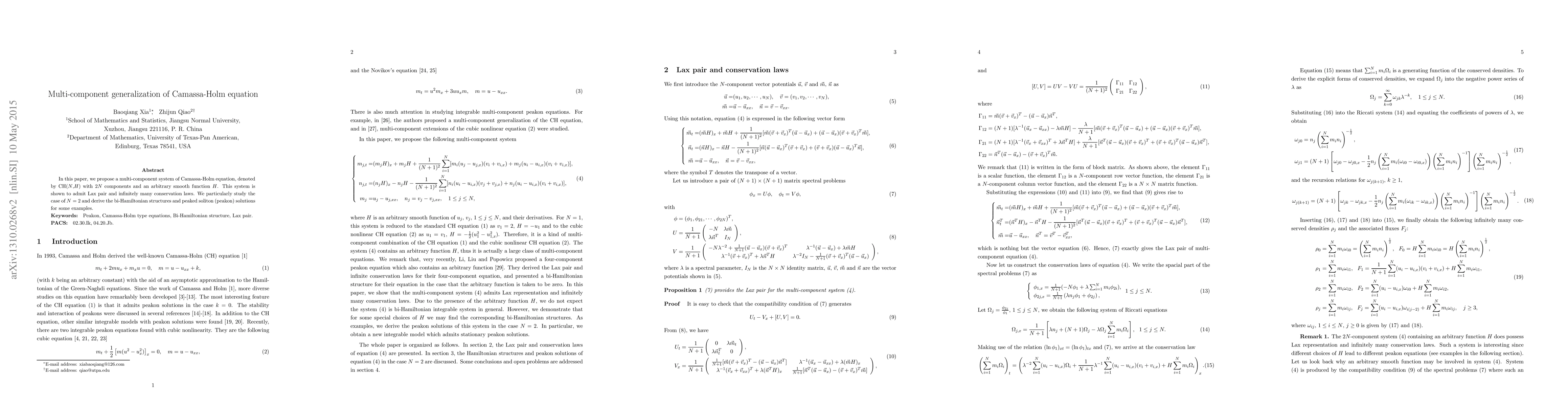 This paper introduces a multi-component generalization of the Camassa-Holm equation, denoted CH($N$,$H$), which includes 2N components and possesses a Lax pair and infinite conservation laws. Special focus is given to the case of N=2, where bi-Hamiltonian structures and peakon solutions are derived.