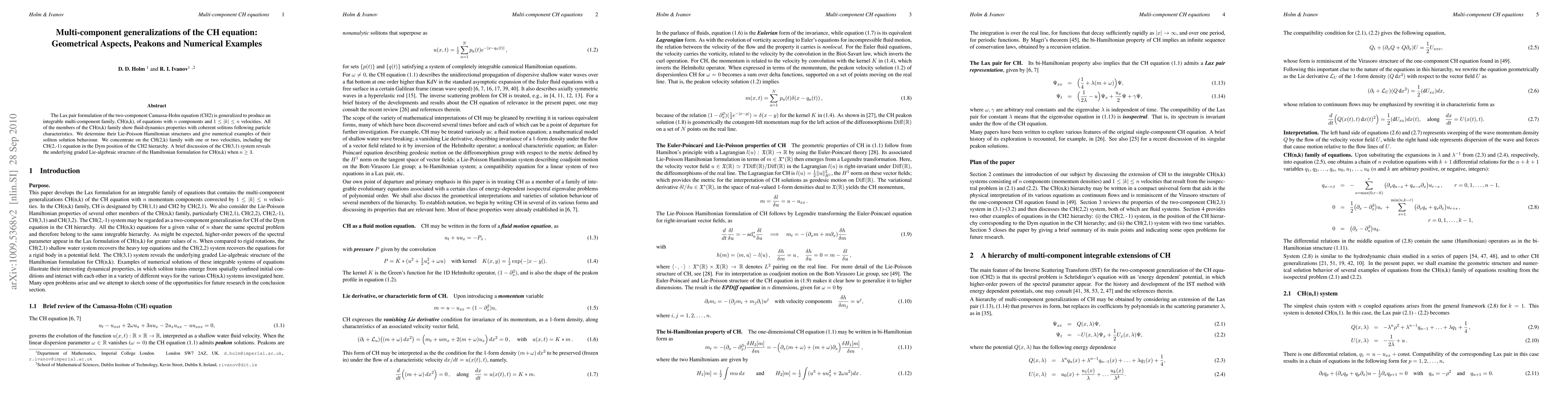 The Lax pair formulation of the two-component Camassa-Holm equation (CH2) is generalized to produce an integrable multi-component family, CH(n,k), of equations with $n$ components and $1\le |k|\le n$ velocities. All of the members of the CH(n,k) family show fluid-dynamics properties with coherent solitons following particle characteristics. We determine their Lie-Poisson Hamiltonian structures and give numerical examples of their soliton solution behaviour. We concentrate on the CH(2,k) family with one or two velocities, including the CH(2,-1) equation in the Dym position of the CH2 hierarchy. A brief discussion of the CH(3,1) system reveals the underlying graded Lie-algebraic structure of the Hamiltonian formulation for CH(n,k) when $n\ge3$.