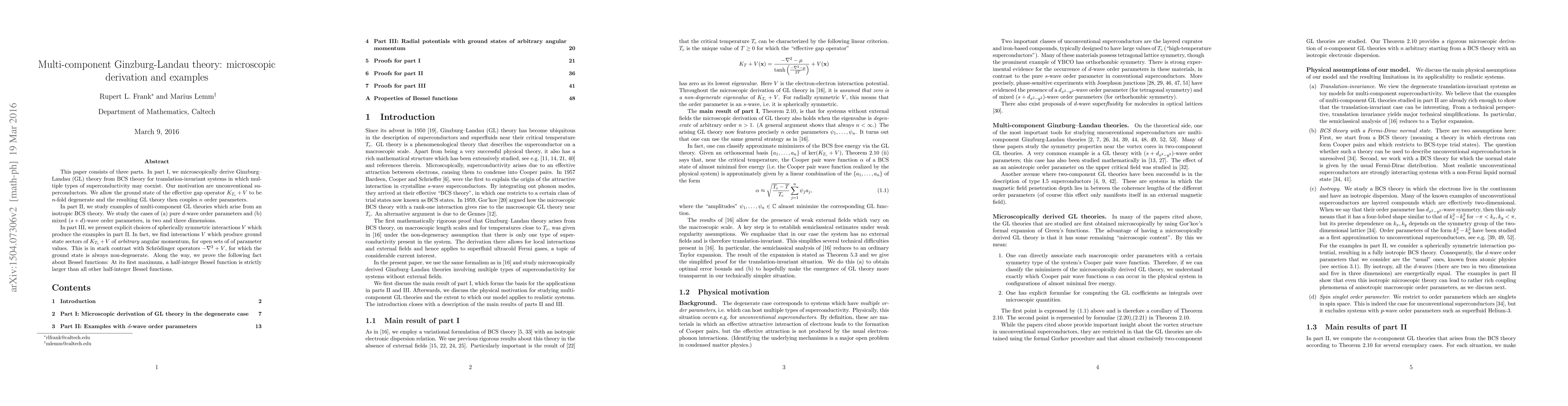 This paper consists of three parts. In part I, we microscopically derive Ginzburg--Landau (GL) theory from BCS theory for translation-invariant systems in which multiple types of superconductivity may coexist. Our motivation are unconventional superconductors. We allow the ground state of the effective gap operator $K_{T_c}+V$ to be $n$-fold degenerate and the resulting GL theory then couples $n$ order parameters. In part II, we study examples of multi-component GL theories which arise from an isotropic BCS theory. We study the cases of (a) pure $d$-wave order parameters and (b) mixed $(s+d)$-wave order parameters, in two and three dimensions. In part III, we present explicit choices of spherically symmetric interactions $V$ which produce the examples in part II. In fact, we find interactions $V$ which produce ground state sectors of $K_{T_c}+V$ of arbitrary angular momentum, for open sets of of parameter values. This is in stark contrast with Schr\"odinger operators $-\nabla^2+V$, for which the ground state is always non-degenerate. Along the way, we prove the following fact about Bessel functions: At its first maximum, a half-integer Bessel function is strictly larger than all other half-integer Bessel functions.