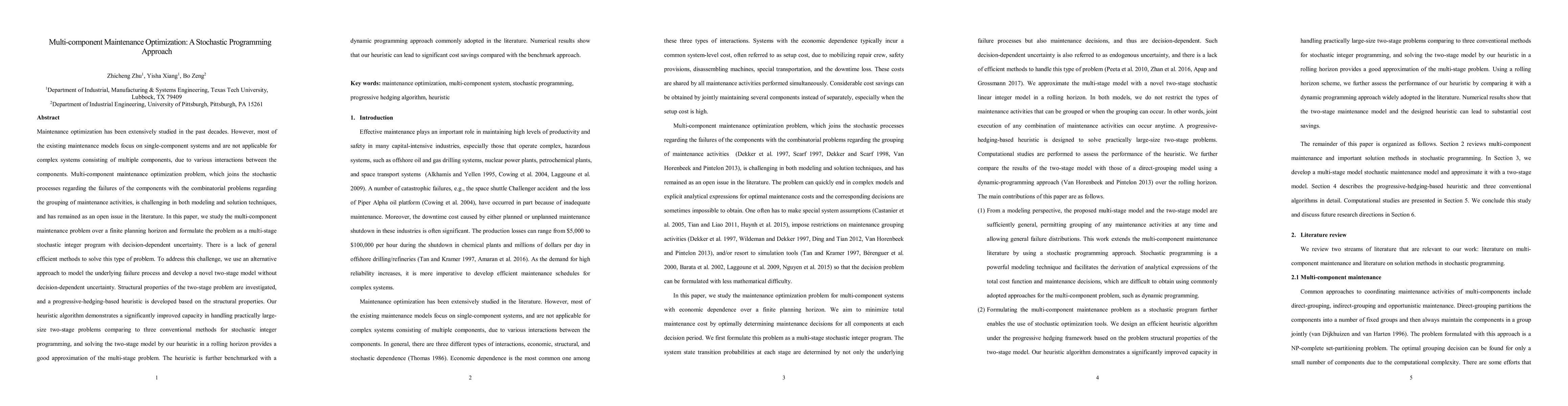 This paper addresses the multi-component maintenance optimization problem using a stochastic programming approach. It formulates the problem as a multi-stage stochastic integer program and introduces a novel two-stage model to tackle decision-dependent uncertainty, developing a heuristic based on structural properties that outperforms conventional methods and provides significant cost savings.