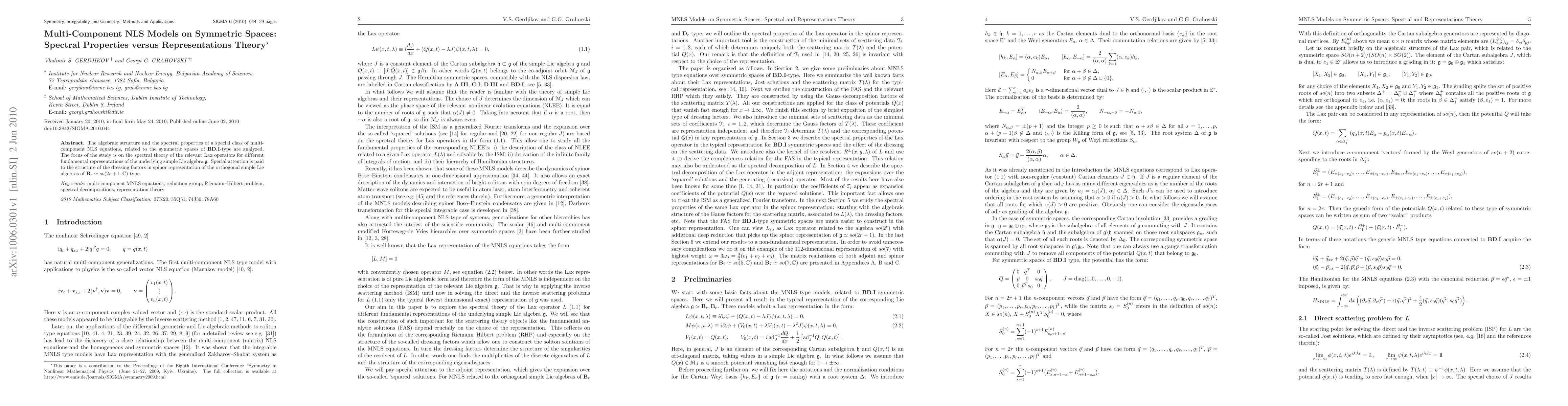 This research paper analyzes spectral properties of multi-component NLS equations on symmetric spaces, focusing on Lax operators and dressing factors for fundamental representations of simple Lie algebras.