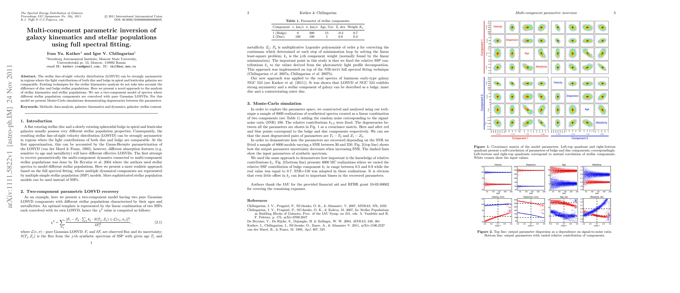 The stellar line-of-sight velocity distribution (LOSVD) can be strongly asymmetric in regions where the light contributions of both disc and bulge in spiral and lenticular galaxies are comparable. Existing techniques for the stellar kinematics analysis do not take into account the difference of disc and bulge stellar populations. Here we present a novel approach to the analysis of stellar kinematics and stellar populations. We use a two-component model of spectra where different stellar population components are convolved with pure Gaussian LOSVDs. For this model we present Monte-Carlo simulations demonstrating degeneracies between the parameters.