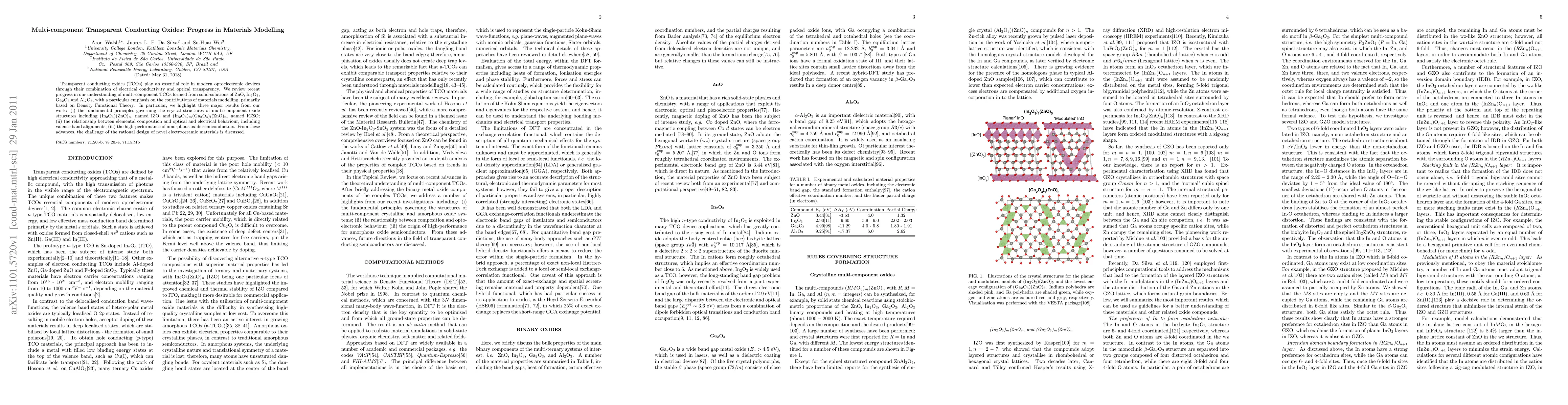 This paper reviews recent advancements in understanding multi-component transparent conducting oxides (TCOs) using materials modelling, focusing on solid-solutions of ZnO, In2O3, Ga2O3, and Al2O3. Key findings include the principles governing their crystal structures, the relationship between elemental composition and their optical/electrical properties, and the high performance of amorphous oxide semiconductors.