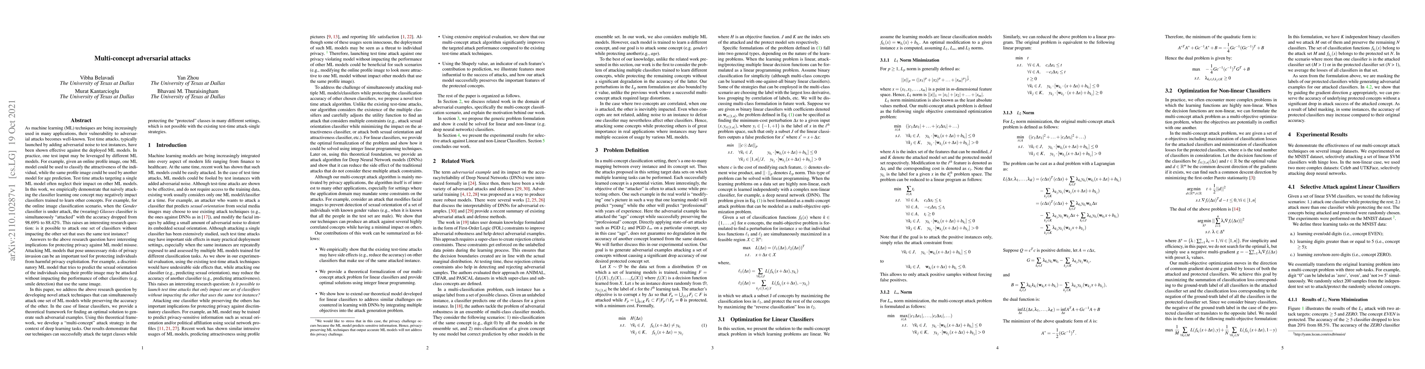 This paper investigates the vulnerability of machine learning models to multi-concept adversarial attacks, demonstrating that attacks on one model can inadvertently affect others using the same test instances. The authors propose novel techniques to attack specific sets of classifiers while preserving the accuracy of others, providing a theoretical framework for linear classifiers and a multi-concept attack strategy for deep learning.