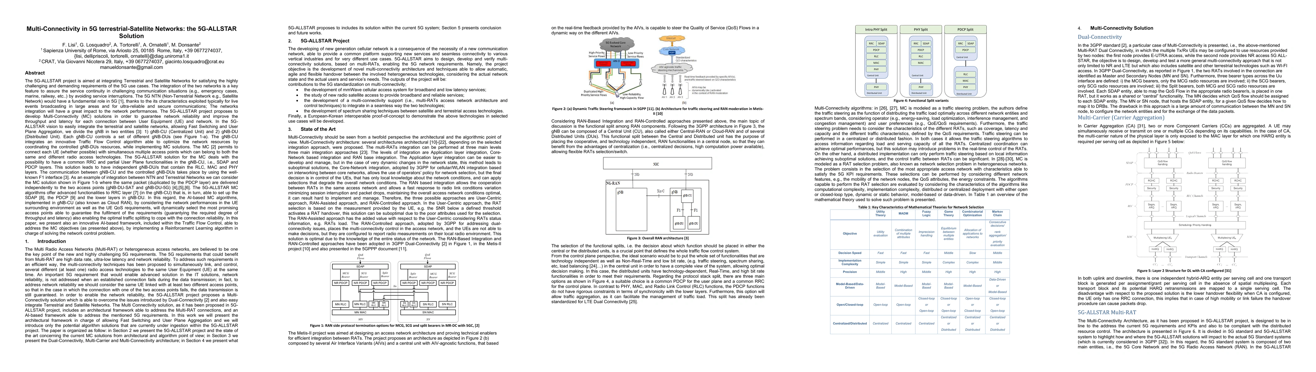 The 5G-ALLSTAR project integrates terrestrial and satellite networks to meet 5G's demanding requirements, proposing multi-connectivity solutions to ensure service continuity and optimize network resources. The project introduces AI-based algorithms for dynamic access point selection and traffic splitting, employing a reinforcement learning framework to enhance network control and performance.