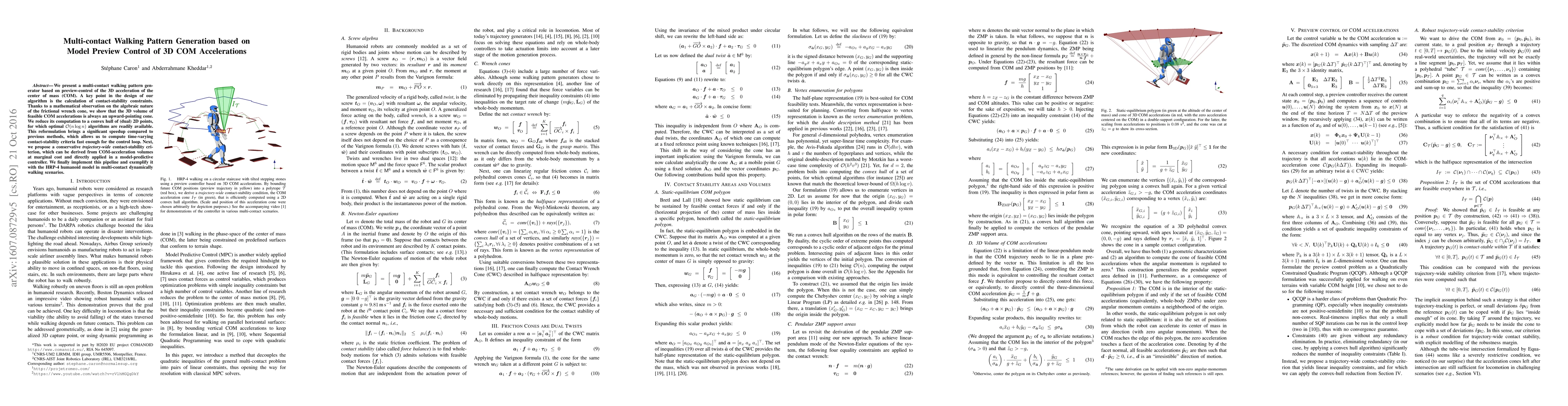 We present a multi-contact walking pattern generator based on preview-control of the 3D acceleration of the center of mass (COM). A key point in the design of our algorithm is the calculation of contact-stability constraints. Thanks to a mathematical observation on the algebraic nature of the frictional wrench cone, we show that the 3D volume of feasible COM accelerations is a always a downward-pointing cone. We reduce its computation to a convex hull of (dual) 2D points, for which optimal O(n log n) algorithms are readily available. This reformulation brings a significant speedup compared to previous methods, which allows us to compute time-varying contact-stability criteria fast enough for the control loop. Next, we propose a conservative trajectory-wide contact-stability criterion, which can be derived from COM-acceleration volumes at marginal cost and directly applied in a model-predictive controller. We finally implement this pipeline and exemplify it with the HRP-4 humanoid model in multi-contact dynamically walking scenarios.