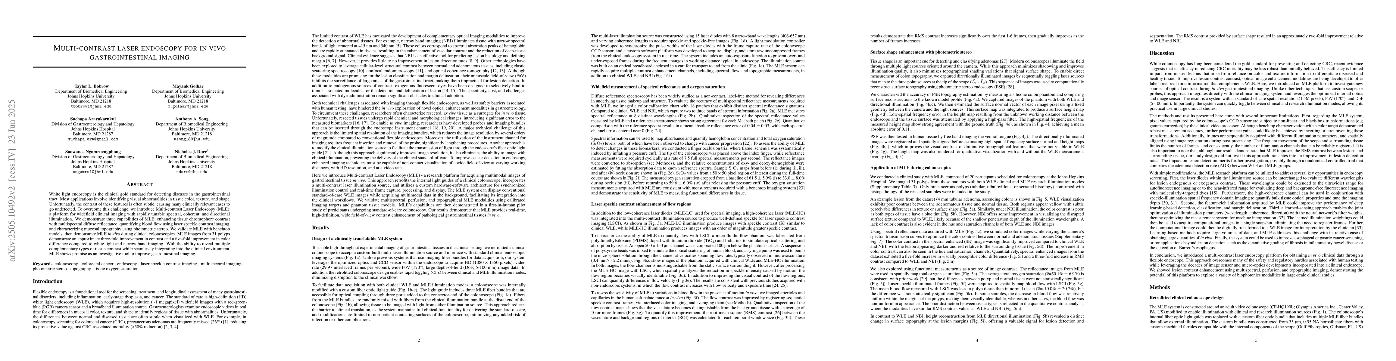 The development and validation of Multi-contrast Laser Endoscopy (MLE), a novel imaging platform that combines spectral diffuse reflectance, laser speckle contrast imaging, and photometric stereo for enhanced gastrointestinal imaging.