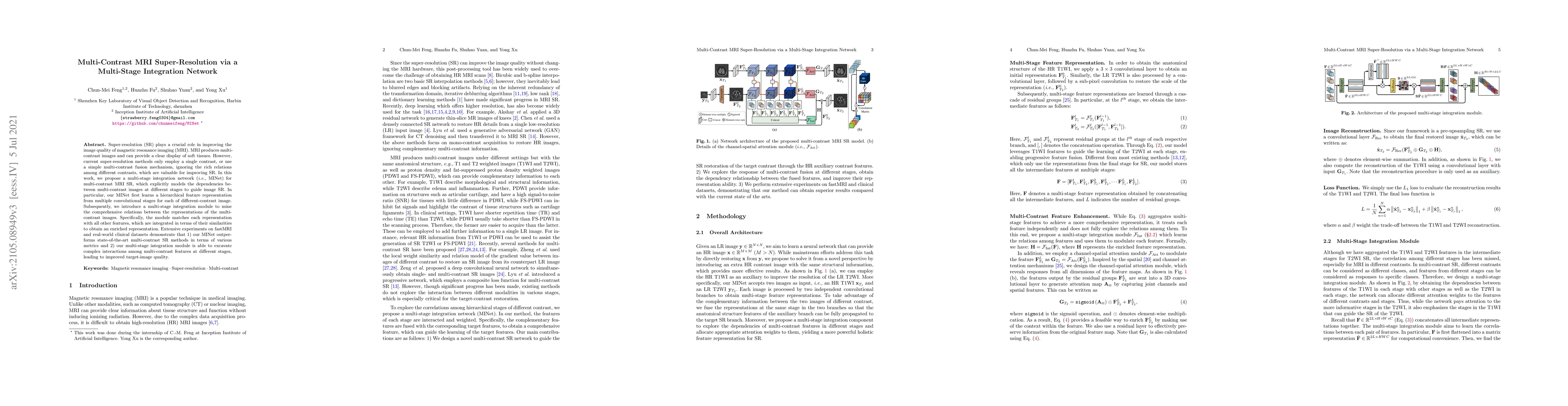 This paper proposes a multi-stage integration network (MINet) for super-resolution of multi-contrast MRI images, which models dependencies between different contrast images to enhance image quality. The MINet outperforms existing methods by leveraging complex interactions among multi-contrast features through a multi-stage integration module.