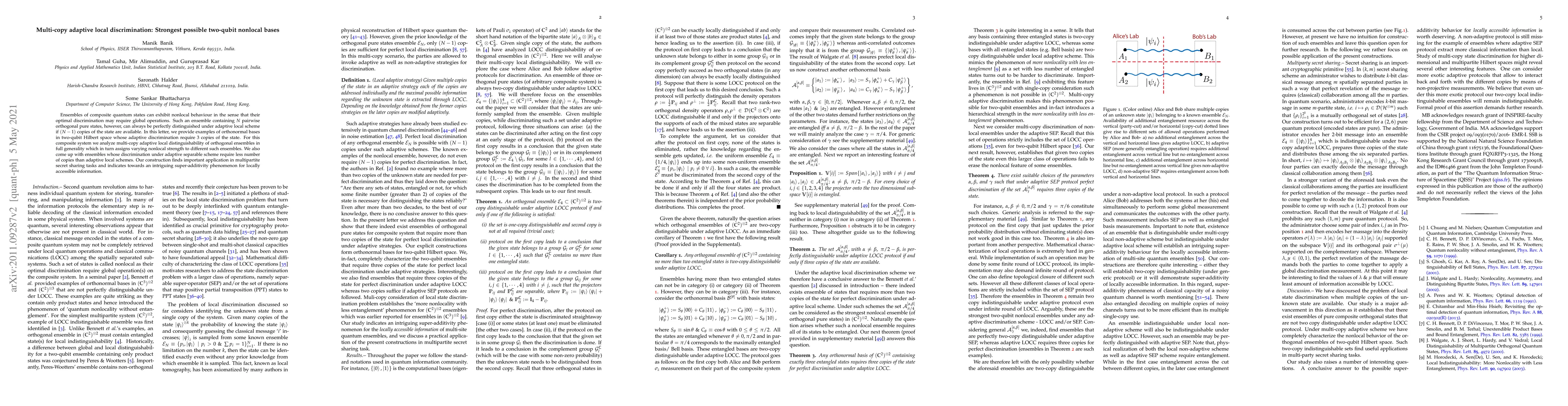 This paper explores multi-copy adaptive local discrimination of two-qubit nonlocal bases, demonstrating that certain orthonormal bases require three copies for optimal discrimination. It reveals ensembles with varying nonlocal strength and highlights a super-additivity phenomenon in locally accessible information, with implications for multipartite secret sharing.