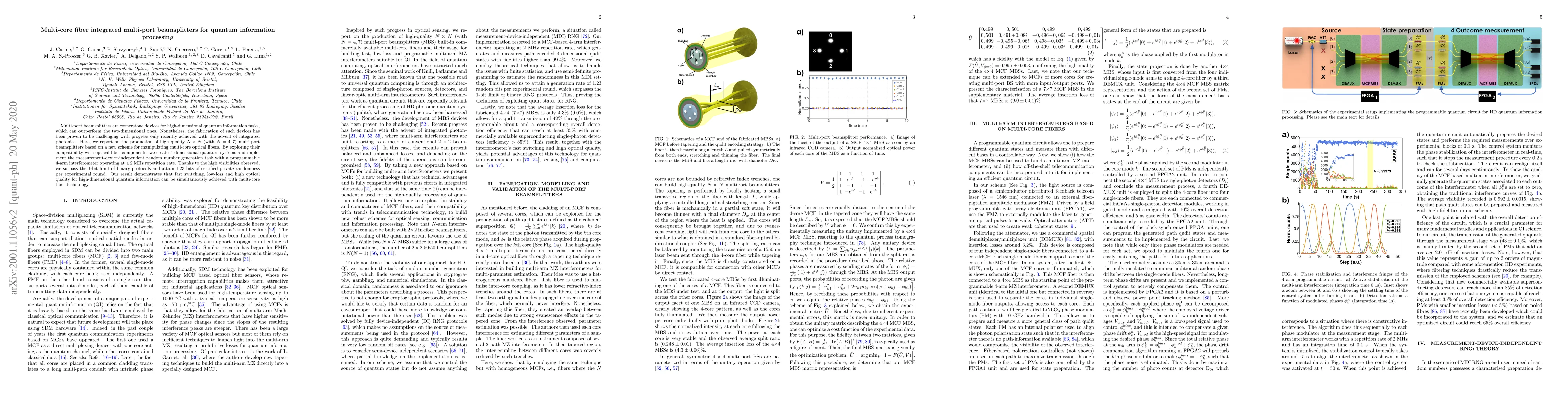 Multi-port beamsplitters are cornerstone devices for high-dimensional quantum information tasks, which can outperform the two-dimensional ones. Nonetheless, the fabrication of such devices has been proven to be challenging with progress only recently achieved with the advent of integrated photonics. Here, we report on the production of high-quality $N \times N$ (with $N=4,7$) multi-port beamsplitters based on a new scheme for manipulating multi-core optical fibers. By exploring their compatibility with optical fiber components, we create 4-dimensional quantum systems and implement the measurement-device-independent random number generation task with a programmable 4-arm interferometer operating at a 2 MHz repetition rate. Thanks to the high visibilities observed, we surpass the 1-bit limit of binary protocols and attain 1.23 bits of certified private randomness per experimental round. Our result demonstrates that fast switching, low-loss and high optical quality for high-dimensional quantum information can be simultaneously achieved with multi-core fiber technology.