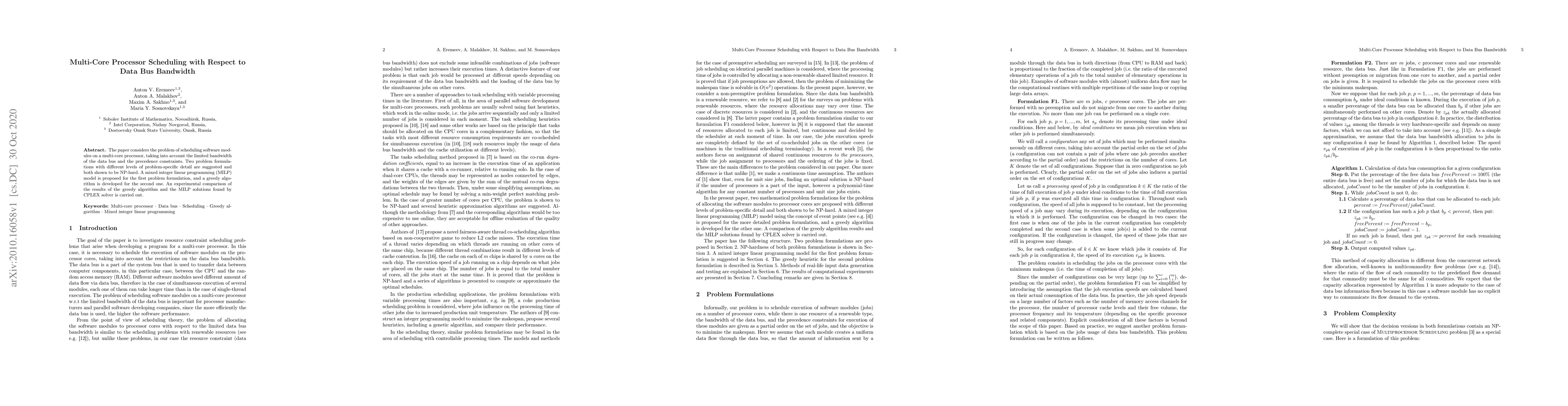 This paper addresses scheduling software modules on a multi-core processor, considering data bus bandwidth limitations and precedence constraints. It proposes two NP-hard problem formulations, a MILP model for the first, and a greedy algorithm for the second, followed by experimental comparisons of both approaches.