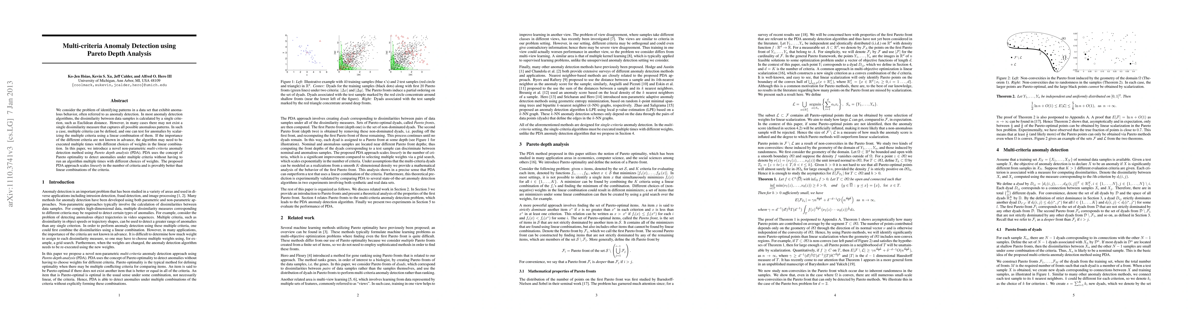 This paper introduces a novel multi-criteria anomaly detection method using Pareto depth analysis (PDA) that identifies anomalies in datasets by leveraging Pareto optimality across multiple criteria, eliminating the need for multiple runs with different weight combinations. The proposed approach scales linearly with the number of criteria and outperforms traditional linear combination methods.