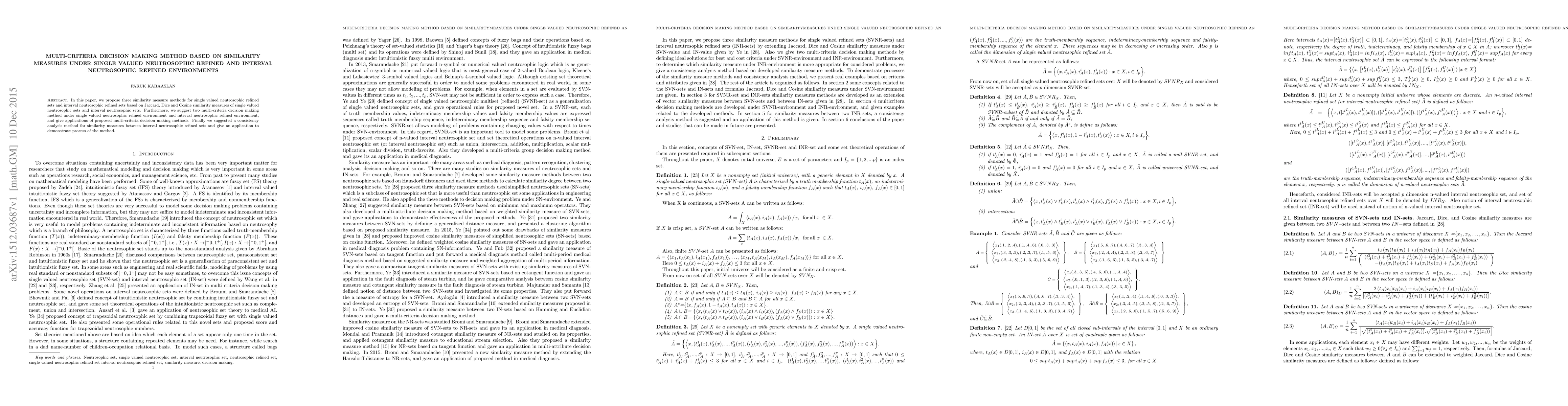 This paper introduces three similarity measure methods for single valued and interval neutrosophic refined sets based on Jaccard, Dice, and Cosine measures. It also proposes two multi-criteria decision-making methods under different neutrosophic environments and demonstrates their application, along with a consistency analysis method for interval neutrosophic refined sets.