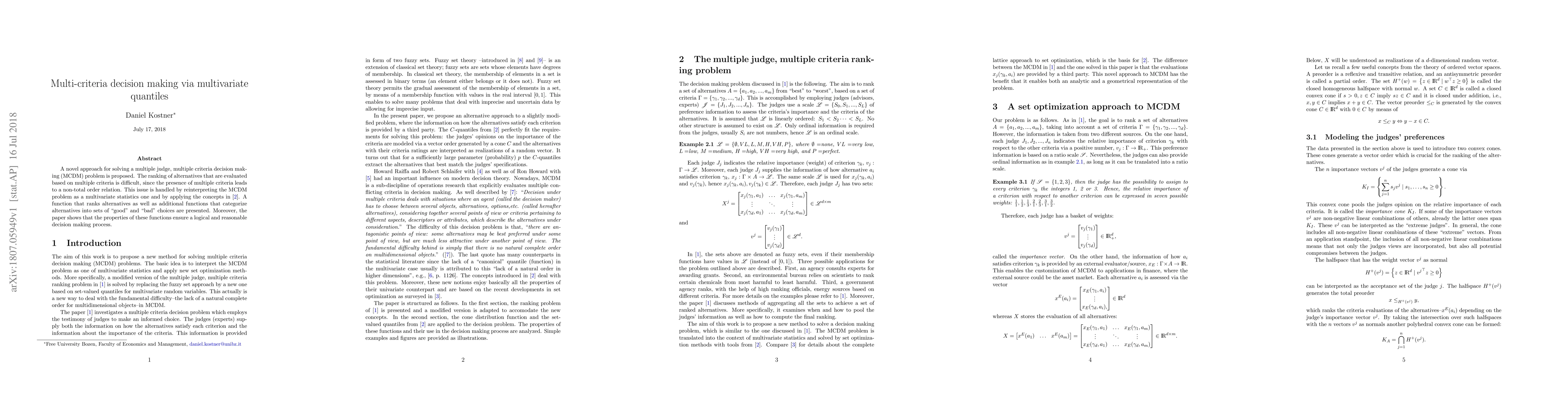 A novel approach for solving a multiple judge, multiple criteria decision making (MCDM) problem is proposed. The ranking of alternatives that are evaluated based on multiple criteria is difficult, since the presence of multiple criteria leads to a non-total order relation. This issue is handled by reinterpreting the MCDM problem as a multivariate statistics one and by solving it via set optimization methods. A function that ranks alternatives as well as additional functions that categorize alternatives into sets of "good" and "bad" choices are presented. Moreover, the paper shows that the properties of these functions ensure a logical and reasonable decision making process.