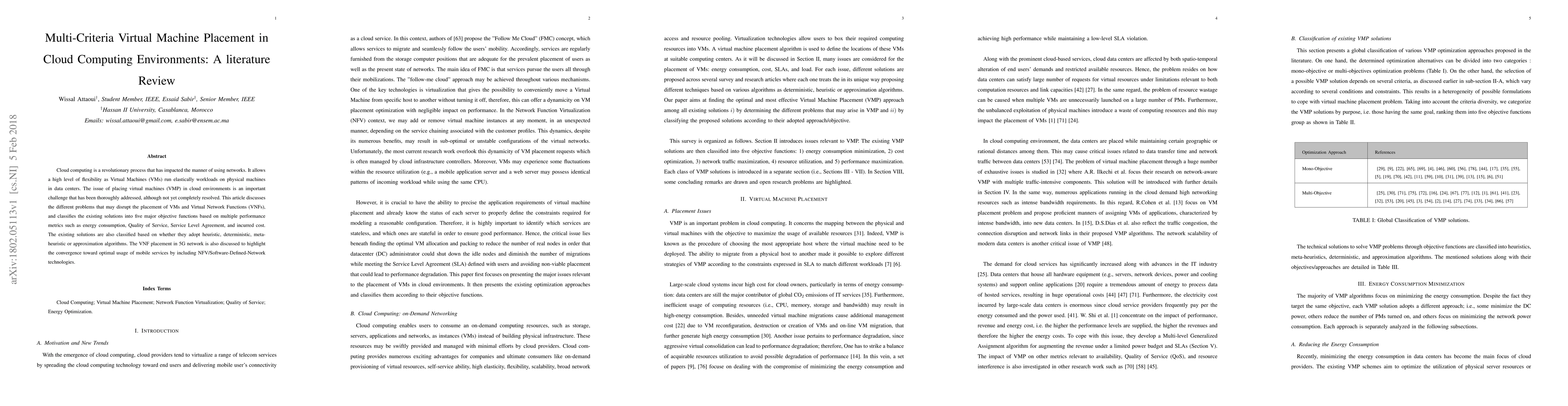 This literature review examines the challenges in virtual machine placement in cloud computing environments, categorizing existing solutions based on performance metrics like energy consumption, QoS, SLA, and cost. It also discusses VNF placement in 5G networks, emphasizing the use of NFV/SDN technologies for optimal mobile service usage.