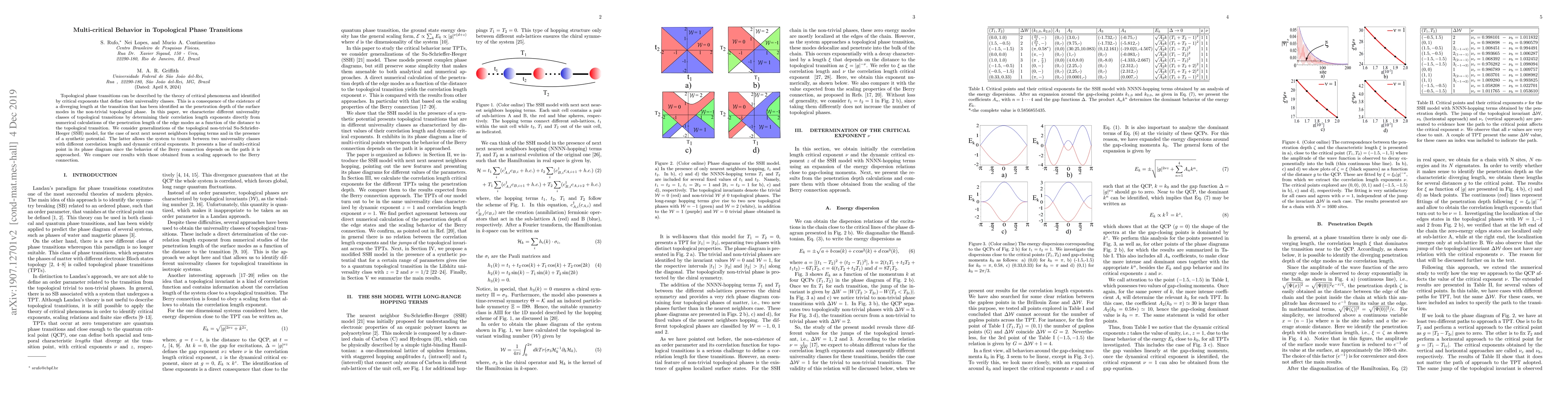 Topological phase transitions can be described by the theory of critical phenomena and identified by critical exponents that define their universality classes. This is a consequence of the existence of a diverging length at the transition that has been identified as the penetration depth of the surface modes in the non-trivial topological phase. In this paper, we characterize different universality classes of topological transitions by determining their correlation length exponents directly from numerical calculations of the penetration length of the edge modes as a function of the distance to the topological transition. We consider generalizations of the topological non-trivial Su-Schrieefer-Heeger (SSH) model, for the case of next nearest neighbors hopping and in the presence of a synthetic potential. The latter allows the system to transit between two universality classes with different correlation length and dynamic critical exponents. It presents a multi-critical point in its phase diagram since the behavior of the Berry connection depends on the path it is approached. We compare our results with those obtained from a scaling approach to the Berry connection.
