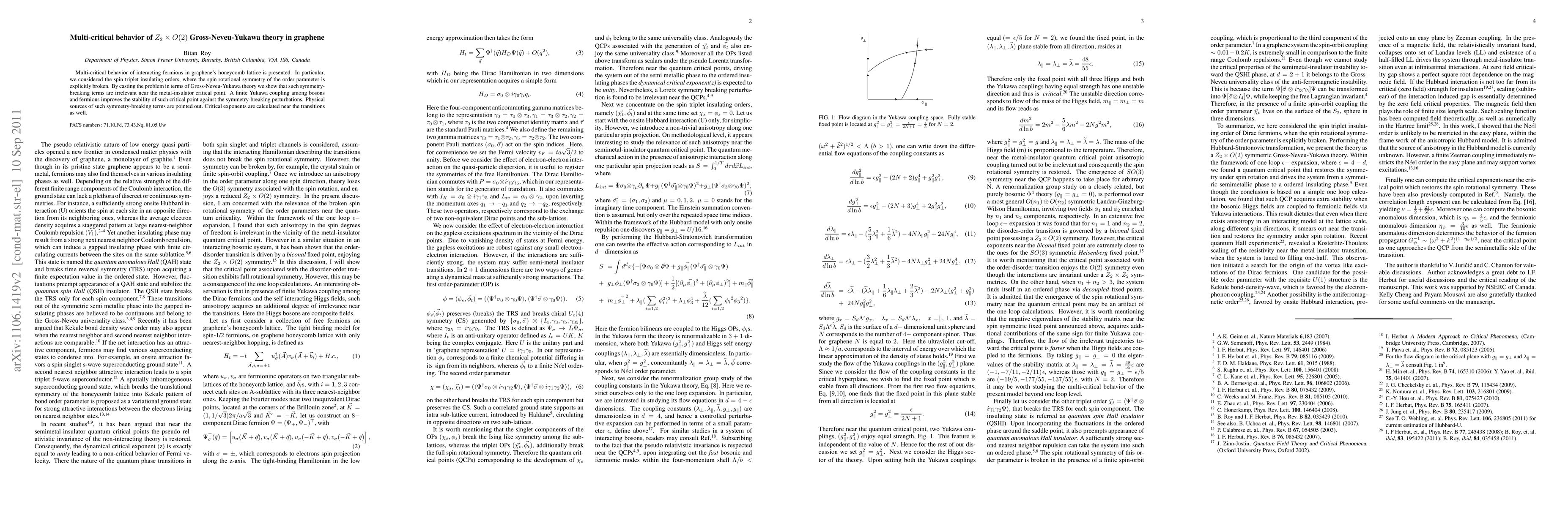 The research investigates the multi-critical behavior of interacting fermions in graphene's lattice, focusing on spin triplet insulating orders and their symmetry-breaking terms. Using Gross-Neveu-Yukawa theory, it demonstrates that these symmetry-breaking terms are irrelevant near the metal-insulator critical point, with a finite Yukawa coupling enhancing critical point stability.