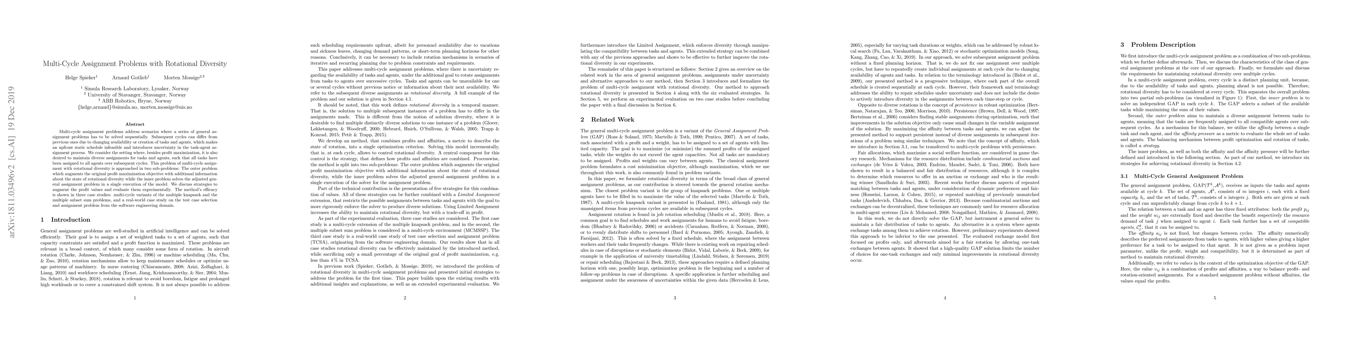 Multi-cycle assignment problems address scenarios where a series of general assignment problems has to be solved sequentially. Subsequent cycles can differ from previous ones due to changing availability or creation of tasks and agents, which makes an upfront static schedule infeasible and introduces uncertainty in the task-agent assignment process. We consider the setting where, besides profit maximization, it is also desired to maintain diverse assignments for tasks and agents, such that all tasks have been assigned to all agents over subsequent cycles. This problem of multi-cycle assignment with rotational diversity is approached in two sub-problems: The outer problem which augments the original profit maximization objective with additional information about the state of rotational diversity while the inner problem solves the adjusted general assignment problem in a single execution of the model. We discuss strategies to augment the profit values and evaluate them experimentally. The method's efficacy is shown in three case studies: multi-cycle variants of the multiple knapsack and the multiple subset sum problems, and a real-world case study on the test case selection and assignment problem from the software engineering domain.