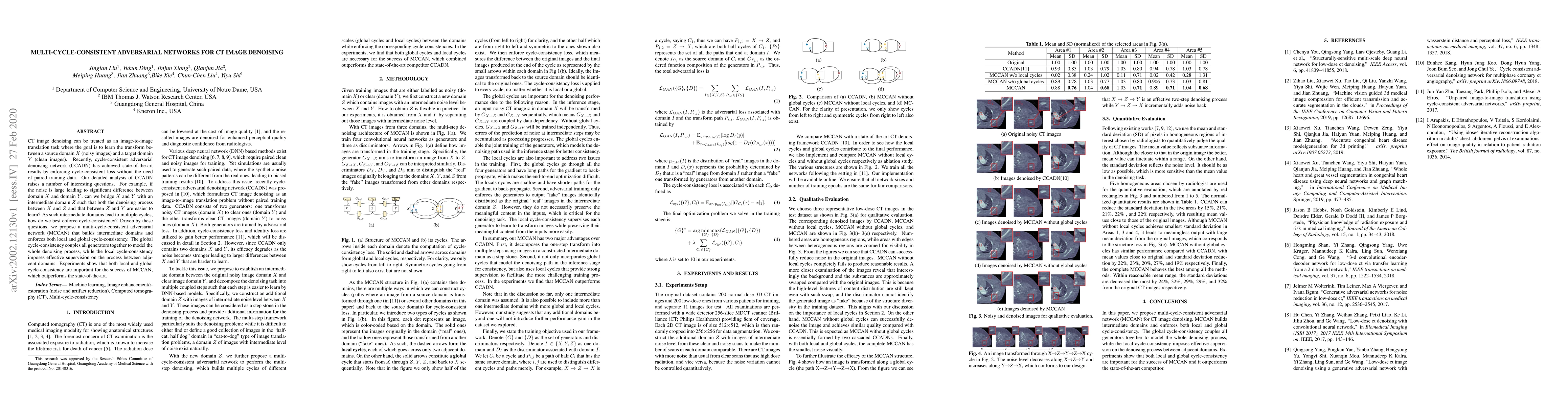 The paper proposes a Multi-Cycle-Consistent Adversarial Network (MCCAN) for CT image denoising, which introduces intermediate domains to bridge noisy and clean images, enforcing both local and global cycle-consistency to enhance denoising performance and outperform state-of-the-art methods.