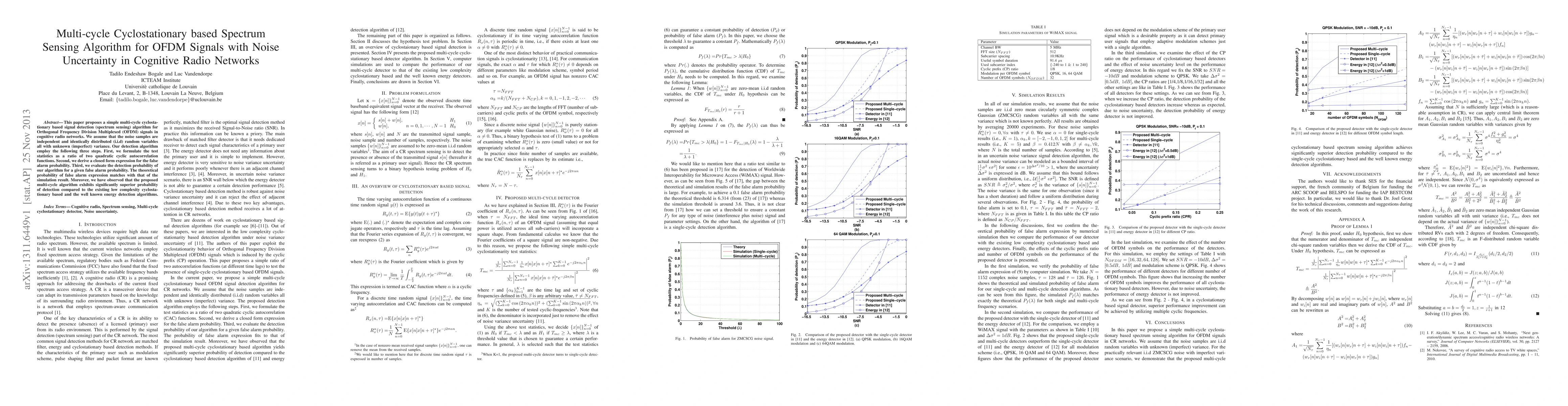This paper introduces a new multi-cycle cyclostationary spectrum sensing algorithm for OFDM signals in cognitive radio networks, assuming unknown noise variance. The algorithm shows superior detection probability compared to existing low-complexity and energy detection methods, with theoretical and simulation results aligning well.