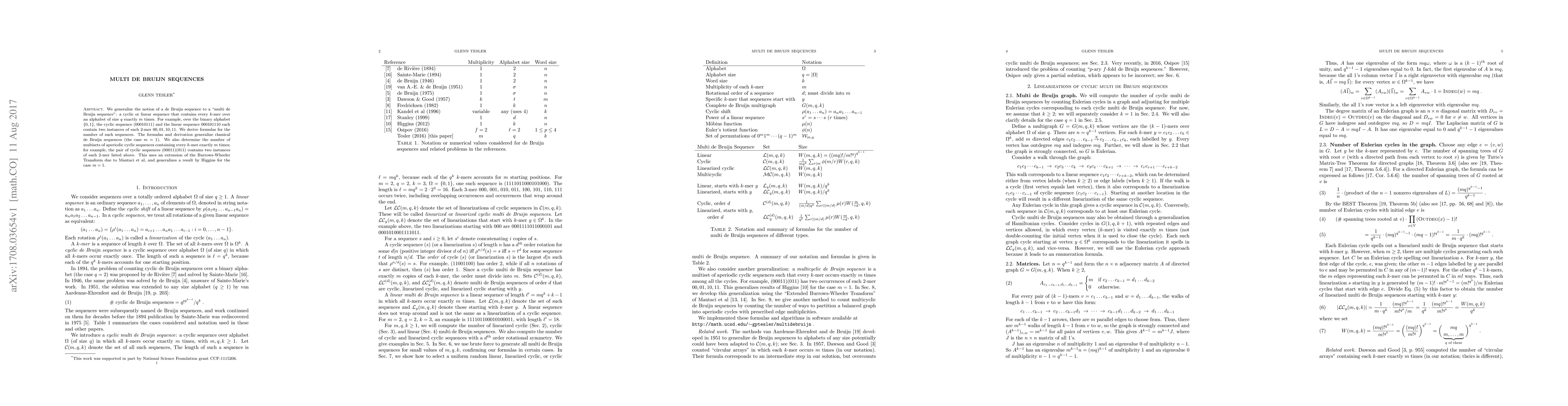 The paper generalizes de Bruijn sequences to "multi de Bruijn sequences," which contain every k-mer exactly m times. It derives formulas for the number of such sequences and generalizes classical de Bruijn sequences, also extending previous results using an adapted Burrows-Wheeler Transform.
