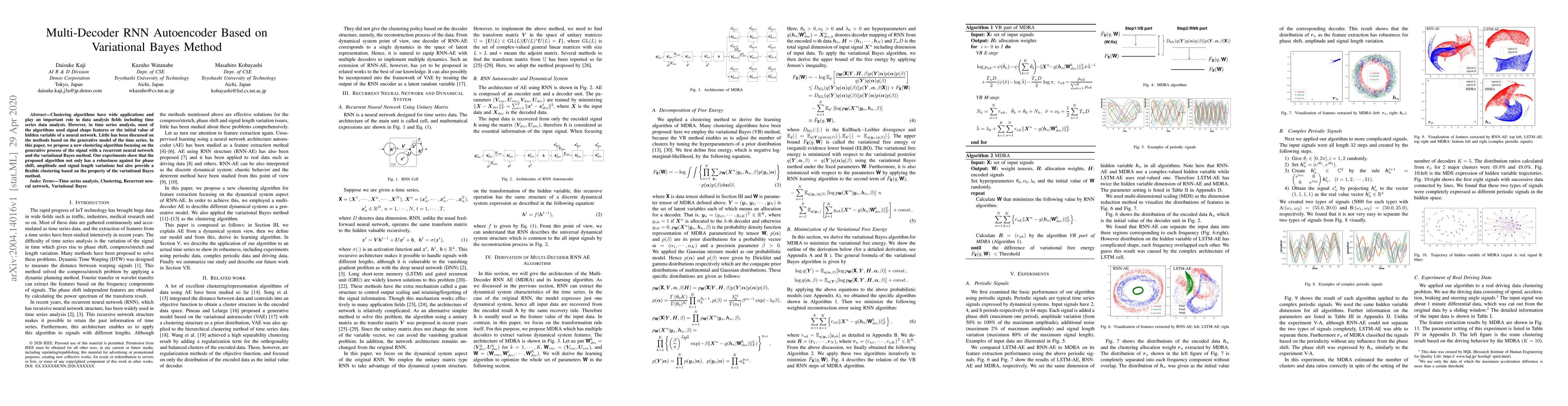 This paper proposes a clustering algorithm using a multi-decoder RNN autoencoder with a variational Bayes method to model the generative process of time series data. The algorithm demonstrates robustness against variations in phase, amplitude, and signal length, and offers flexible clustering based on the variational Bayes property.