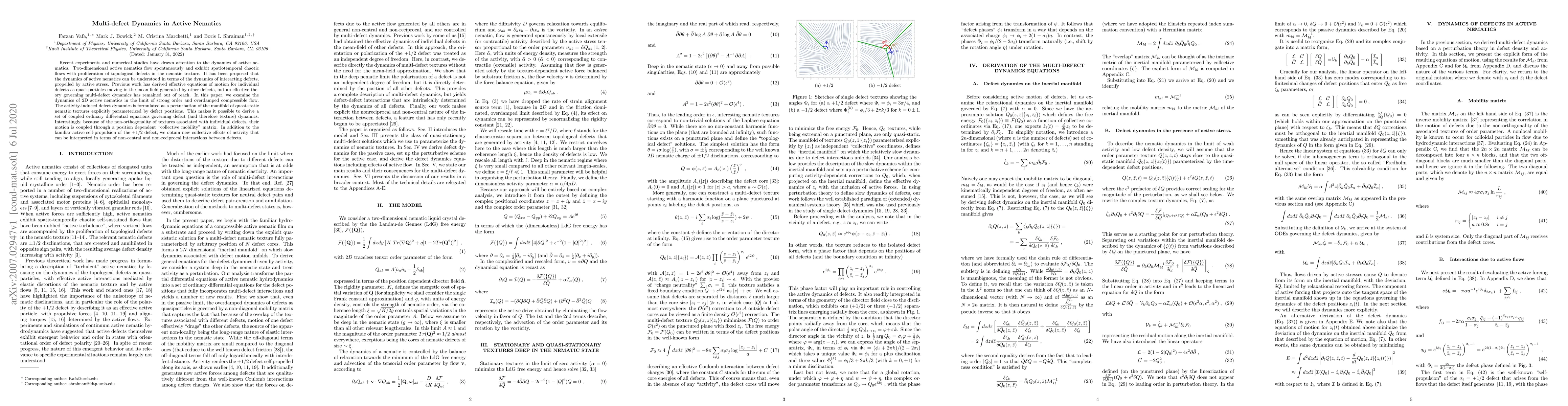Recent experiments and numerical studies have drawn attention to the dynamics of active nematics. Two-dimensional active nematics flow spontaneously and exhibit spatiotemporal chaotic flows with proliferation of topological defects in the nematic texture. It has been proposed that the dynamics of active nematics can be understood in terms of the dynamics of interacting defects, propelled by active stress. Previous work has derived effective equations of motion for individual defects as quasi-particles moving in the mean field generated by other defects, but an effective theory governing multi-defect dynamics has remained out of reach. In this paper, we examine the dynamics of 2D active nematics in the limit of strong order and overdamped compressible flow. The activity-induced defect dynamics is formulated as a perturbation of the manifold of quasi-static nematic textures explicitly parameterized by defect positions. This makes it possible to derive a set of coupled ordinary differential equations governing defect (and therefore texture) dynamics. Interestingly, because of the non-orthogonality of textures associated with individual defects, their motion is coupled through a position dependent ``collective mobility" matrix. In addition to the familiar active self-propulsion of the $+1/2$ defect, we obtain new collective effects of activity that can be interpreted in terms of non-central and non-reciprocal interactions between defects.