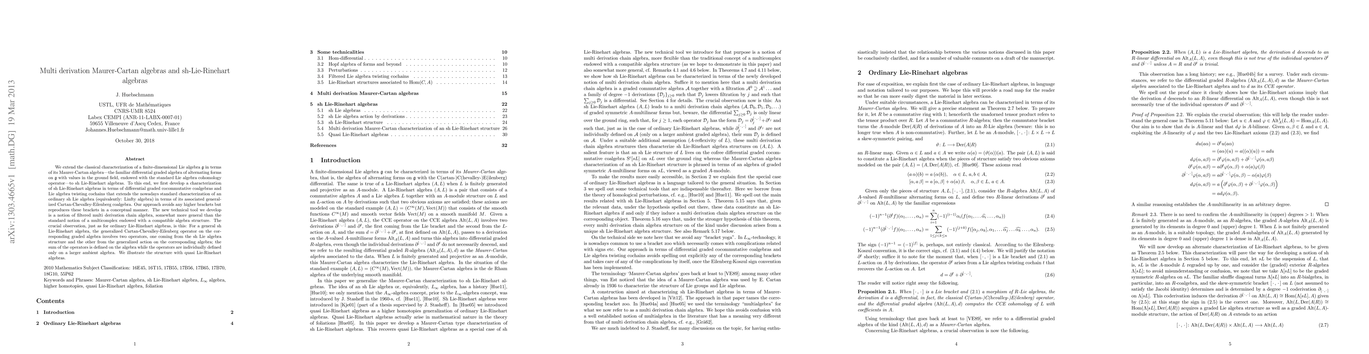 We extend the classical characterization of a finite-dimensional Lie algebra g in terms of its Maurer-Cartan algebra-the familiar differential graded algebra of alternating forms on g with values in the ground field, endowed with the standard Lie algebra cohomology operator-to sh Lie-Rinehart algebras. To this end, we first develop a characterization of sh Lie-Rinehart algebras in terms of differential graded cocommutative coalgebras and Lie algebra twisting cochains that extends the nowadays standard characterization of an ordinary sh Lie algebra (equivalently: Linfty algebra) in terms of its associated generalized Cartan-Chevalley-Eilenberg coalgebra. Our approach avoids any higher brackets but reproduces these brackets in a conceptual manner. The new technical tool we develop is a notion of filtered multi derivation chain algebra, somewhat more general than the standard notion of a multicomplex endowed with a compatible algebra structure. The crucial observation, just as for ordinary Lie-Rinehart algebras, is this: For a general sh Lie-Rinehart algebra,the generalized Cartan-Chevalley-Eilenberg operator on the corresponding graded algebra involves two operators, one coming from the sh Lie algebra structure and the other from the generalized action on the corresponding algebra; the sum of the operators is defined on the algebra while the operators are individually defined only on a larger ambient algebra. We illustrate the structure with quasi Lie-Rinehart algebras.