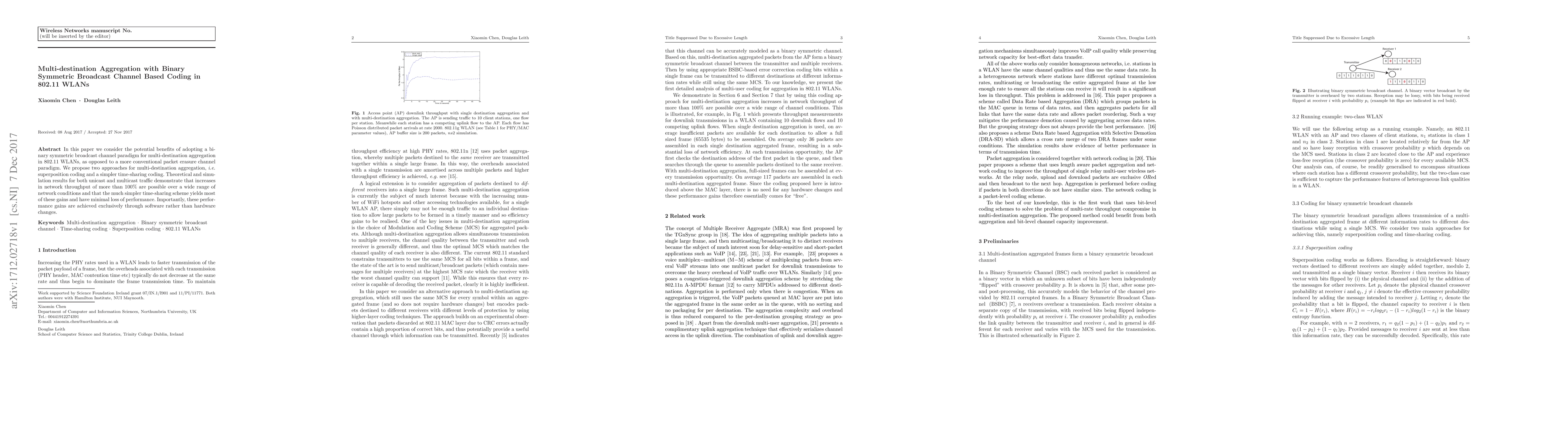 This paper explores the benefits of using a binary symmetric broadcast channel for multi-destination aggregation in 802.11 WLANs, proposing two coding approaches: superposition coding and time-sharing coding. Simulation results show significant throughput improvements (over 100%) achievable through software changes, with the simpler time-sharing scheme providing most of the gains with minimal performance loss.