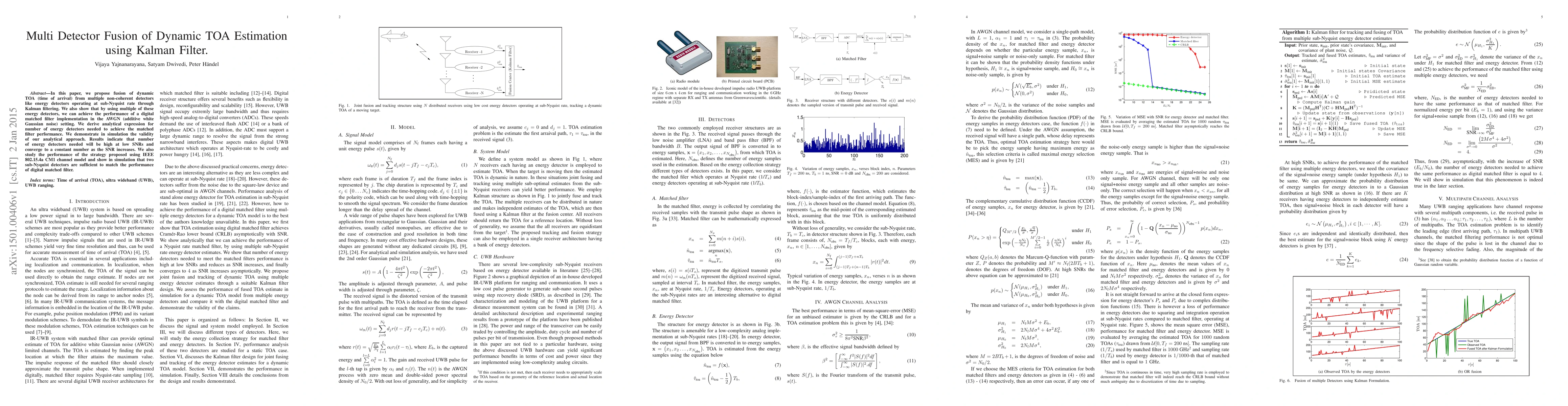 In this paper, we propose fusion of dynamic TOA (time of arrival) from multiple non-coherent detectors like energy detectors operating at sub-Nyquist rate through Kalman filtering. We also show that by using multiple of these energy detectors, we can achieve the performance of a digital matched filter implementation in the AWGN (additive white Gaussian noise) setting. We derive analytical expression for number of energy detectors needed to achieve the matched filter performance. We demonstrate in simulation the validity of our analytical approach. Results indicate that number of energy detectors needed will be high at low SNRs and converge to a constant number as the SNR increases. We also study the performance of the strategy proposed using IEEE 802.15.4a CM1 channel model and show in simulation that two sub-Nyquist detectors are sufficient to match the performance of digital matched filter.