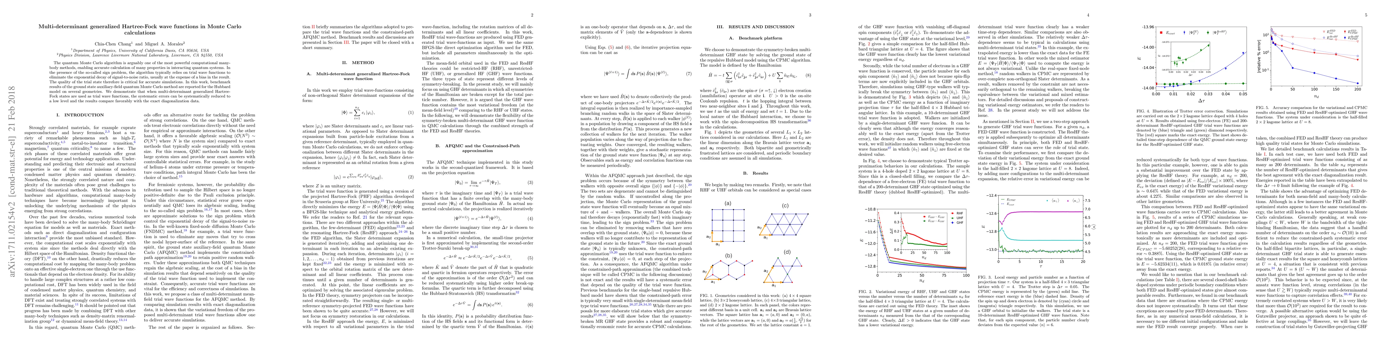 This paper investigates the use of multi-determinant generalized Hartree-Fock wave functions as trial states in quantum Monte Carlo simulations to tackle the sign problem, achieving reduced systematic errors and favorable comparisons with exact diagonalization data for the Hubbard model.