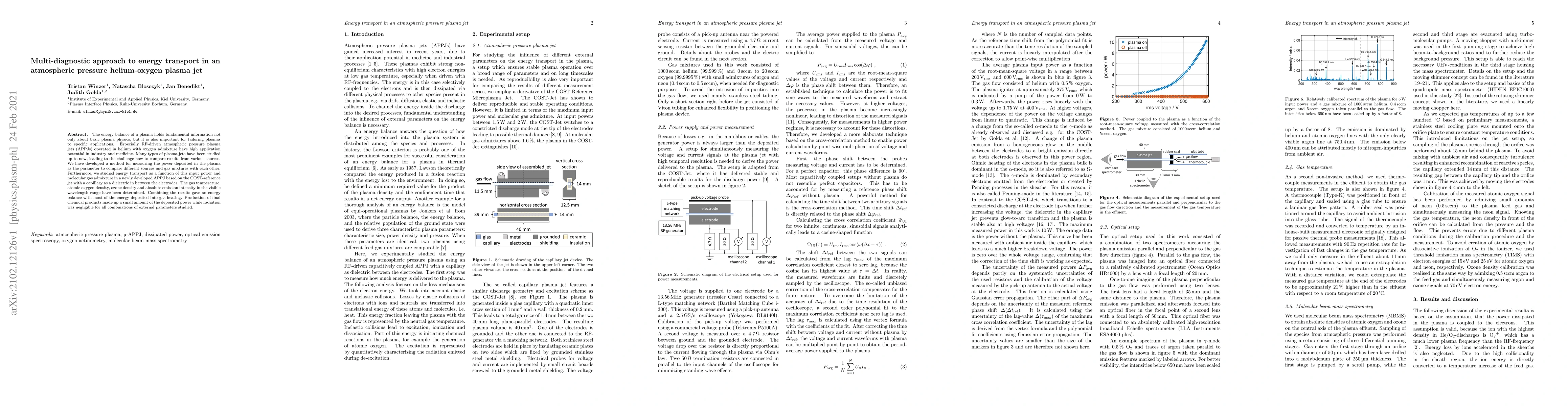 This paper presents a multi-diagnostic approach to measure and analyze energy transport in an atmospheric pressure helium-oxygen plasma jet, revealing that most energy goes into gas heating, with minor contributions to chemical products and negligible radiation. The study aims to standardize comparisons across different plasma sources and gas mixtures.