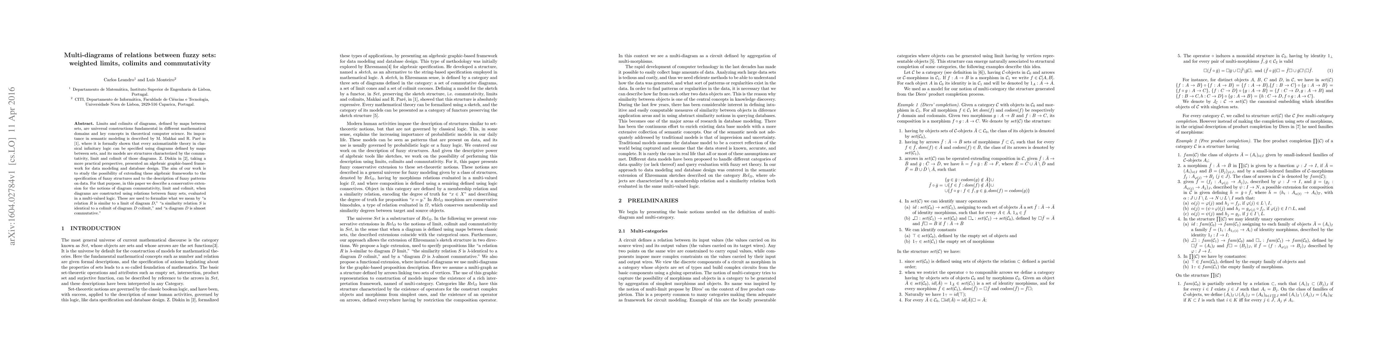 Limits and colimits of diagrams, defined by maps between sets, are universal constructions fundamental in different mathematical domains and key concepts in theoretical computer science. Its importance in semantic modeling is described by M. Makkai and R. Par\'e, where it is formally shown that every axiomatizable theory in classical infinitary logic can be specified using diagrams defined by maps between sets, and its models are structures characterized by the commutativity, limit and colimit of those diagrams. Z. Diskin taking a more practical perspective, presented an algebraic graphic-based framework for data modeling and database design. The aim of our work is to study the possibility of extending these algebraic frameworks to the specification of fuzzy structures and to the description of fuzzy patterns on data. For that purpose, in this paper we describe a conservative extension for the notions of diagram commutativity, limit and colimit, when diagrams are constructed using relations between fuzzy sets, evaluated in a multi-valued logic. These are used to formalize what we mean by "a relation $R$ is similar to a limit of diagram $D$," "a similarity relation $S$ is identical to a colimit of diagram $D$ colimit," and "a diagram $D$ is almost commutative."