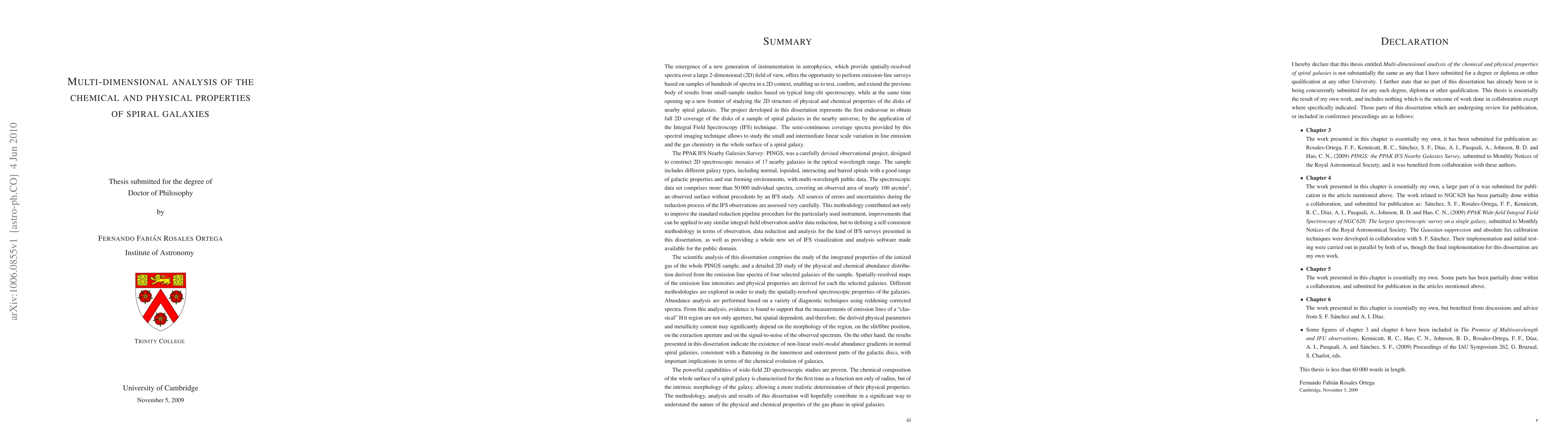 In this thesis, wide-field 2D spectroscopy is employed in order to characterise the nebular properties of late-type field galaxies. The observations performed for this dissertation represent the first endeavour to obtain full 2D coverage of the disks of a sample of nearby spiral galaxies, by the application of the Integral Field Spectroscopy (IFS) technique, under the PPAK IFS Nearby Galaxies Survey: PINGS. A self-consistent methodology is defined in terms of observation, data reduction and analysis techniques for this and upcoming IFS surveys, as well as providing a whole new set of IFS visualization and analysis software made available for the public domain (PINGSoft). The scientific analysis comprises the study of the integrated properties of the ionized gas and a detailed 2D study from the emission line spectra of four selected galaxies. Evidence is found suggesting that measurements of emission lines of classical HII regions are not only aperture, but spatial dependent, and therefore, the derived physical parameters and metallicity content may significantly depend on the morphology of the region, on the extraction aperture and on the signal-to-noise of the observed spectrum. Furthermore, observational evidence of non-linear multi-modal abundance gradients in normal spiral galaxies is found, consistent with a flattening in the innermost and outermost parts of the galactic discs, with important implications in terms of the chemical evolution of galaxies.