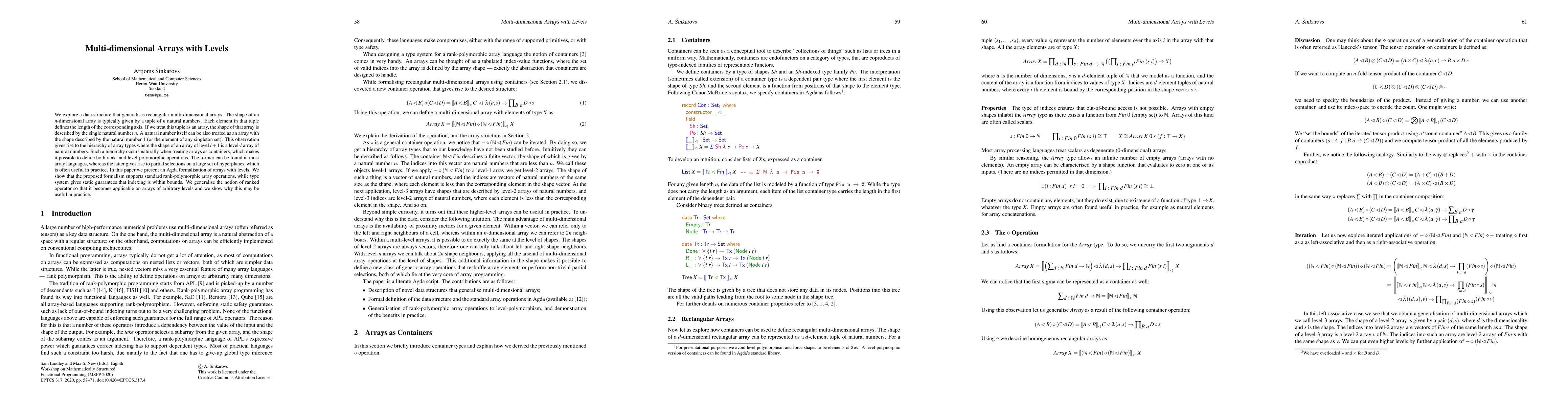 We explore a data structure that generalises rectangular multi-dimensional arrays. The shape of an n-dimensional array is typically given by a tuple of n natural numbers. Each element in that tuple defines the length of the corresponding axis. If we treat this tuple as an array, the shape of that array is described by the single natural number n. A natural number itself can be also treated as an array with the shape described by the natural number 1 (or the element of any singleton set). This observation gives rise to the hierarchy of array types where the shape of an array of level l+1 is a level-l array of natural numbers. Such a hierarchy occurs naturally when treating arrays as containers, which makes it possible to define both rank- and level-polymorphic operations. The former can be found in most array languages, whereas the latter gives rise to partial selections on a large set of hyperplanes, which is often useful in practice. In this paper we present an Agda formalisation of arrays with levels. We show that the proposed formalism supports standard rank-polymorphic array operations, while type system gives static guarantees that indexing is within bounds. We generalise the notion of ranked operator so that it becomes applicable on arrays of arbitrary levels and we show why this may be useful in practice.