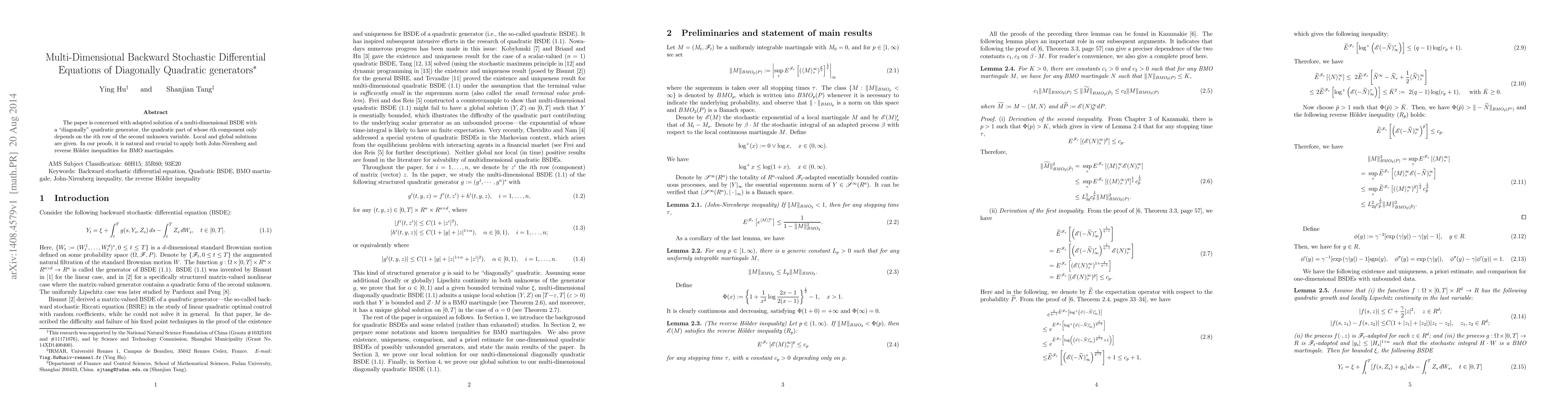 This paper investigates solutions to a specific type of stochastic differential equation (SDE) known as multi-dimensional backward stochastic differential equations (BSDEs), focusing on those with diagonally quadratic generators. It provides local and global solution methods using inequalities for BMO martingales.