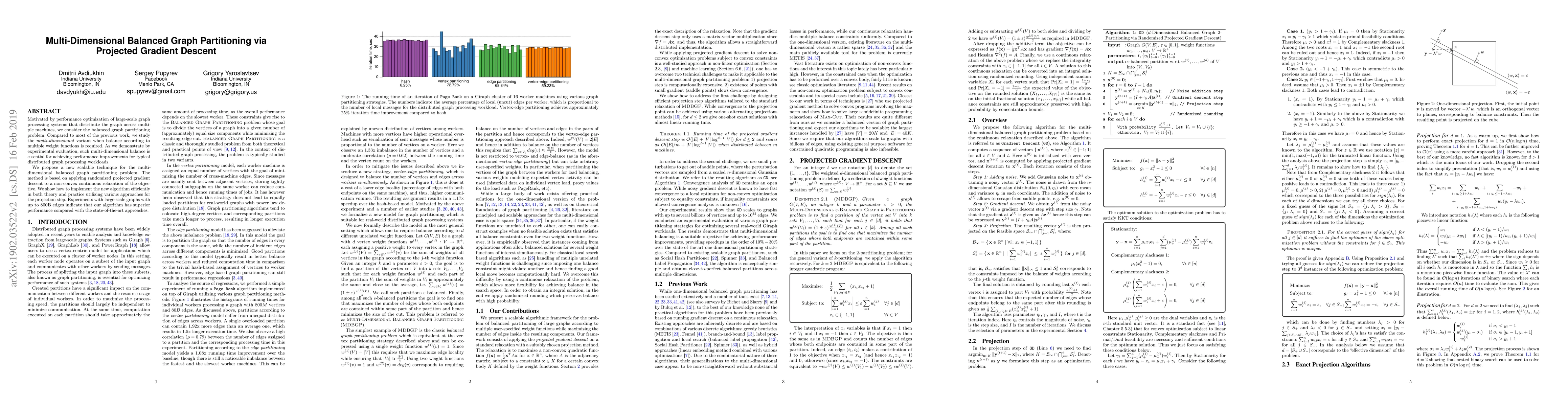 This paper proposes a new scalable technique for multi-dimensional balanced graph partitioning using randomized projected gradient descent on a continuous relaxation of the objective. The method achieves superior performance for large-scale distributed graph processing workloads, as demonstrated by experiments on large social networks.