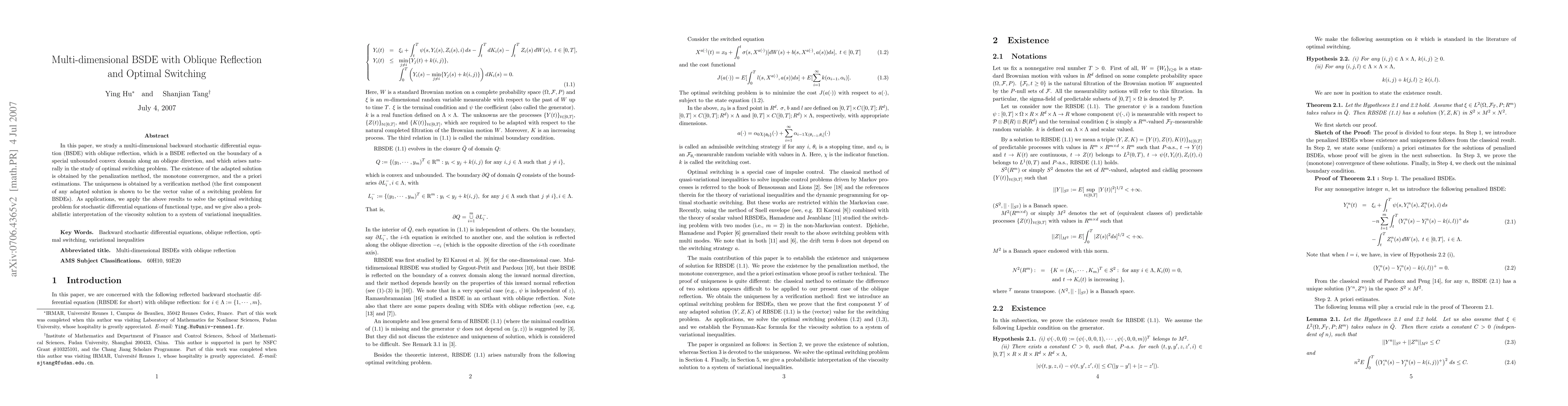 In this paper, we study a multi-dimensional backward stochastic differential equation (BSDE) with oblique reflection, which is a BSDE reflected on the boundary of a special unbounded convex domain along an oblique direction, and which arises naturally in the study of optimal switching problem. The existence of the adapted solution is obtained by the penalization method, the monotone convergence, and the a priori estimations. The uniqueness is obtained by a verification method (the first component of any adapted solution is shown to be the vector value of a switching problem for BSDEs). As applications, we apply the above results to solve the optimal switching problem for stochastic differential equations of functional type, and we give also a probabilistic interpretation of the viscosity solution to a system of variational inequalities.