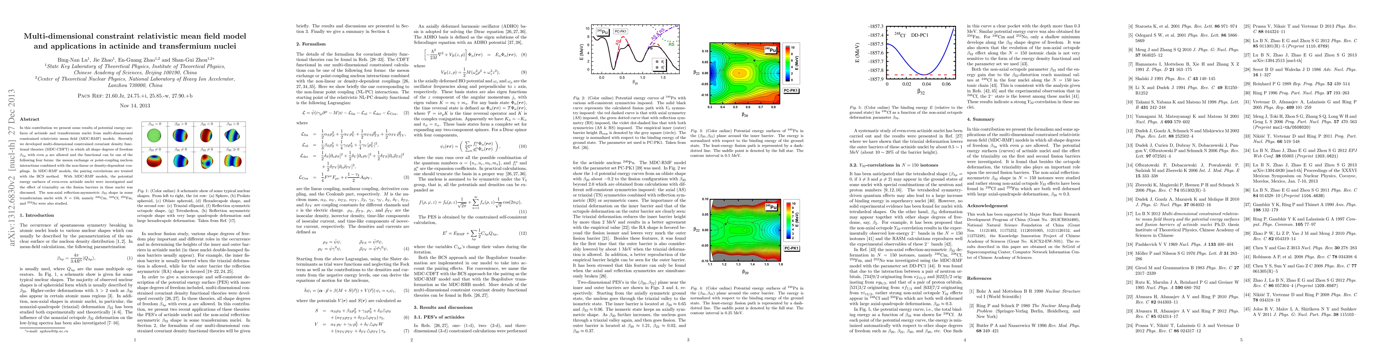 This paper presents potential energy surfaces of actinide and transfermium nuclei derived from multi-dimensional constrained relativistic mean field (MDC-RMF) models, focusing on the effects of triaxiality on fission barriers and non-axial reflection-asymmetric shapes in specific heavy nuclei. The study employs advanced covariant density functional theories to explore shape degrees of freedom.