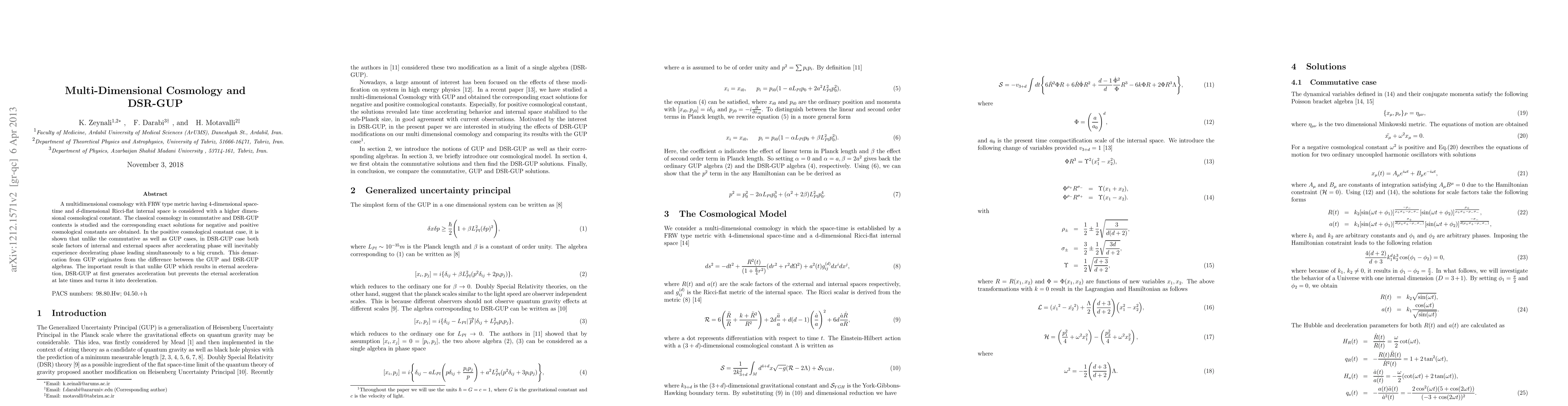 The research investigates a multidimensional cosmology with FRW type metric, incorporating a 4-dimensional spacetime and a d-dimensional Ricci-flat internal space, subjected to a higher-dimensional cosmological constant. Exact solutions are derived for both negative and positive cosmological constants in commutative and DSR-GUP contexts.