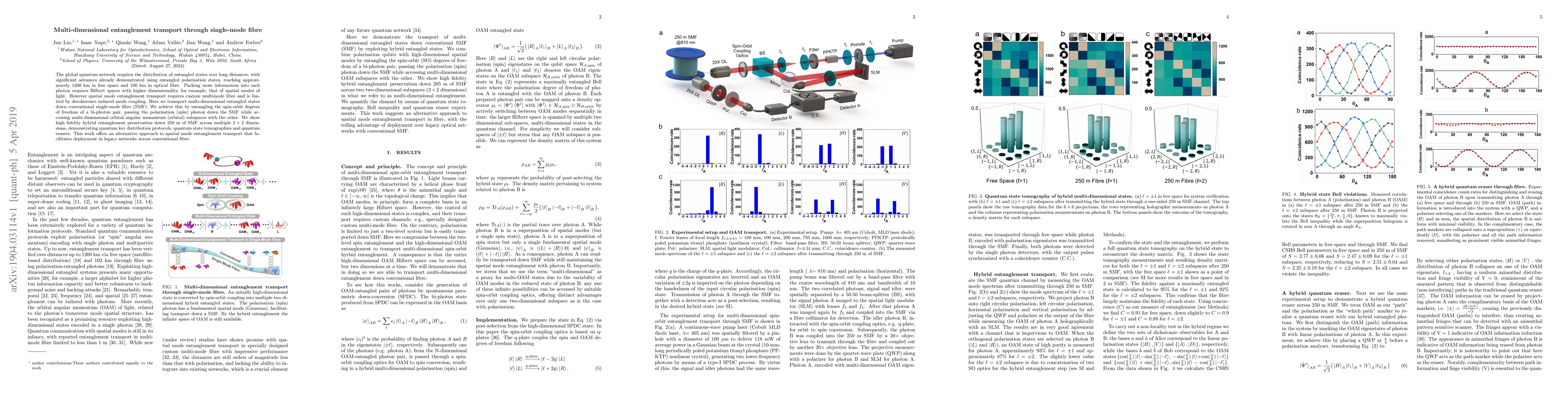The global quantum network requires the distribution of entangled states over long distances, with significant advances already demonstrated using entangled polarisation states, reaching approximately 1200 km in free space and 100 km in optical fibre. Packing more information into each photon requires Hilbert spaces with higher dimensionality, for example, that of spatial modes of light. However spatial mode entanglement transport requires custom multimode fibre and is limited by decoherence induced mode coupling. Here we transport multi-dimensional entangled states down conventional single-mode fibre (SMF). We achieve this by entangling the spin-orbit degrees of freedom of a bi-photon pair, passing the polarisation (spin) photon down the SMF while accessing multi-dimensional orbital angular momentum (orbital) subspaces with the other. We show high fidelity hybrid entanglement preservation down 250 m of SMF across multiple 2x2 dimensions, demonstrating quantum key distribution protocols, quantum state tomographies and quantum erasers. This work offers an alternative approach to spatial mode entanglement transport that facilitates deployment in legacy networks across conventional fibre.