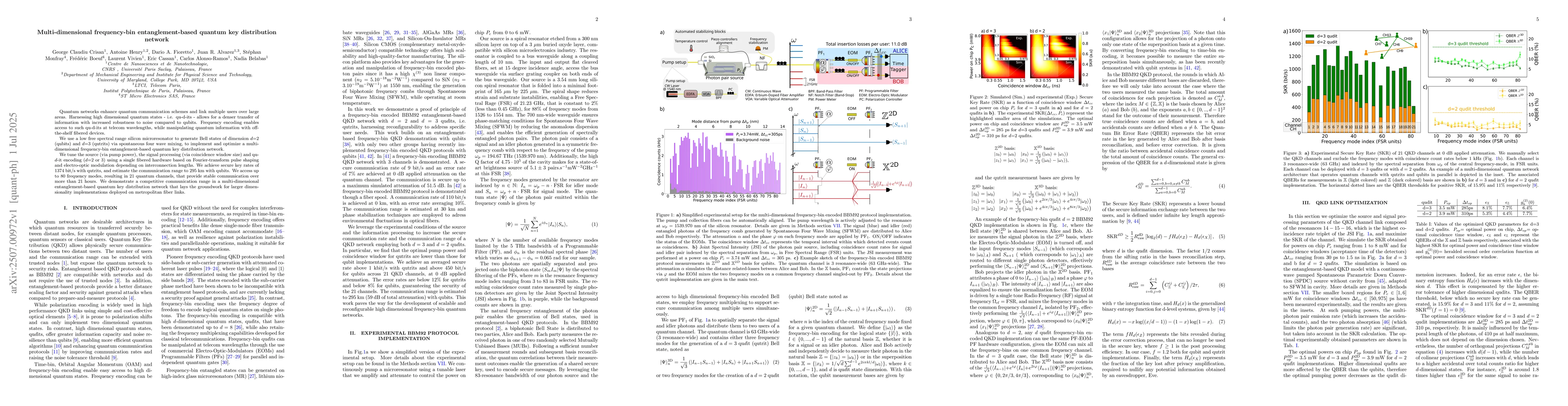 Quantum networks enhance quantum communication schemes and link multiple users over large areas. Harnessing high dimensional quantum states - i.e. qu-d-its - allows for a denser transfer of information with increased robustness to noise compared to qubits. Frequency encoding enables access to such qu-d-its at telecom wavelengths, while manipulating quantum information with off-the-shelf fibered devices. We use a low free spectral range silicon microresonator to generate Bell states of dimension d=2 (qubits) and d=3 (qutrits) via spontaneous four wave mixing, to implement and optimize a multi-dimensional frequency-bin entanglement-based quantum key distribution network. We tune the source (via pump power), the signal processing (via coincidence window size) and qu-d-it encoding (d=2 or 3) using a single fibered hardware based on Fourier-transform pulse shaping and electro-optic modulation depending on interconnection lengths. We achieve secure key rates of 1374 bit/s with qutrits, and estimate the communication range to 295 km with qubits. We access up to 80 frequency modes, resulting in 21 quantum channels, that provide stable communication over more than 21 hours. We demonstrate a competitive communication range in a multi-dimensional entanglement-based quantum key distribution network that lays the groundwork for larger dimensionality implementations deployed on metropolitan fiber links.