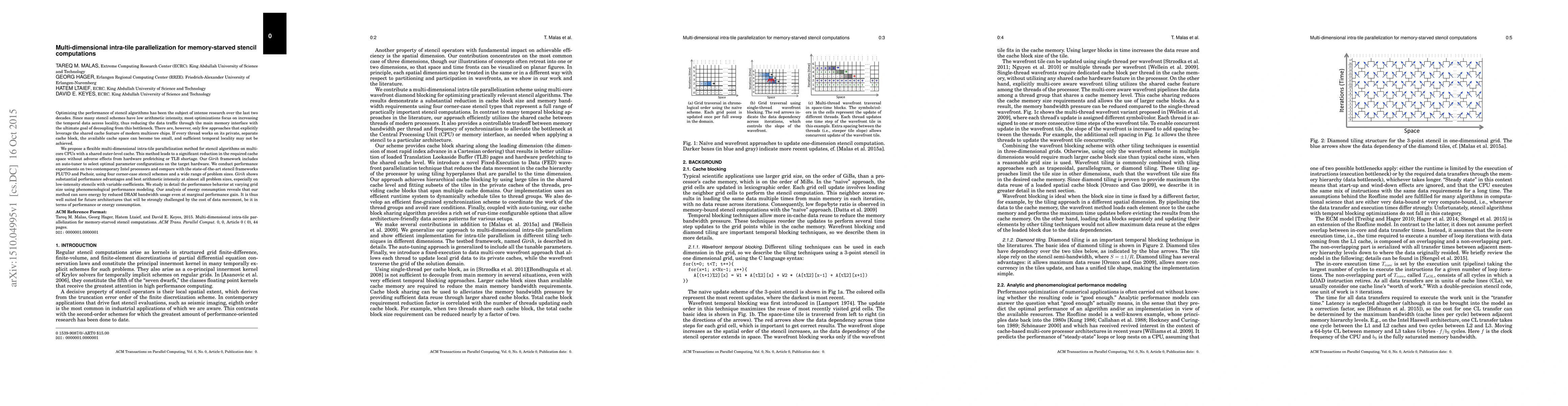 This paper introduces a multi-dimensional intra-tile parallelization method for optimizing stencil computations on multicore CPUs, aiming to reduce cache space usage and improve temporal data locality. The proposed Girih framework significantly outperforms existing stencil optimizations in terms of performance and energy efficiency, especially on low-intensity stencils.