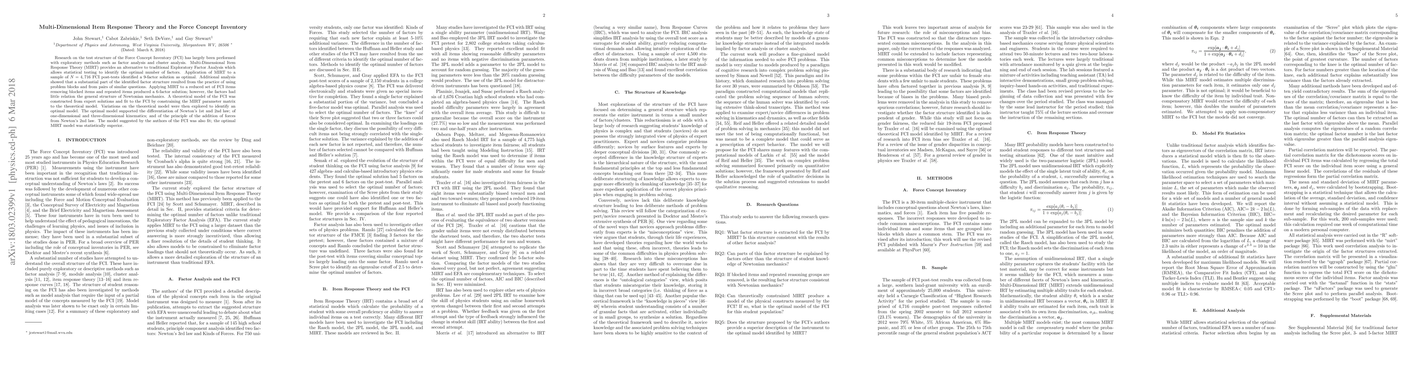 This study applies Multi-Dimensional Item Response Theory (MIRT) to the Force Concept Inventory (FCI), identifying a 9-factor structure from a large sample. A refined model excluding similar and blocked items revealed a 6-factor solution with limited Newtonian mechanics relevance. The optimal MIRT model differentiated key Newtonian mechanics concepts, outperforming the original FCI model.